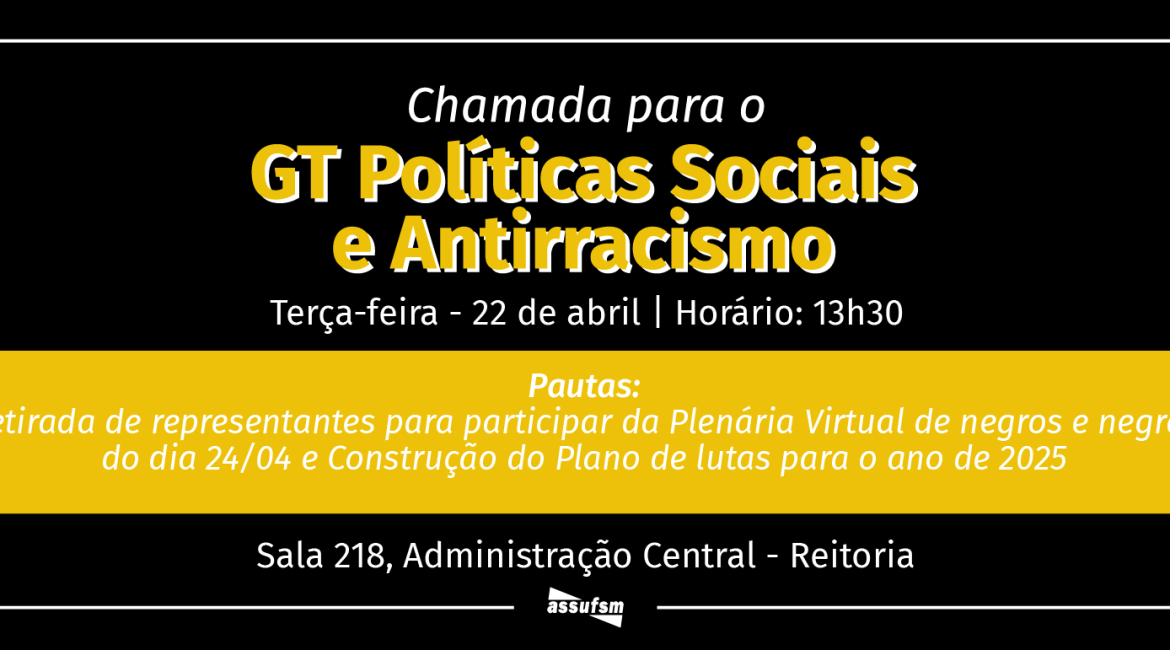 Hoje, terça-feira, dia 22 de abril, ocorre a reunião do GT Políticas Sociais e Antirracismo da Assufsm, a partir das 13h30mina, na sala 218, na Reitoria da UFSM, no Campus Sede.