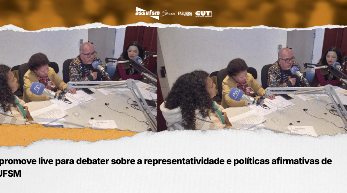 Na manhã dessa terça-feira, 13 de maio, a Assufsm realizou uma live para debater a representatividade e políticas afirmativas de cotas na UFSM. A live contou com a presença da TAE Angela Souza integrante do NEABI, da Coordenadora Geral Alessandra Alfaro, do Coordenador de Esporte Cultura e Lazer Paulo Quadrado e da TAE Aposentada Vânia Paulon. A data da live foi escolhida pelo GT Políticas Sociais e Antirracistas da Assufsm, visto o marco do dia 13 de maio: a Lei Áurea foi assinada em 13 de maio de 1988, e aboliu oficialmente a escravidão no Brasil.