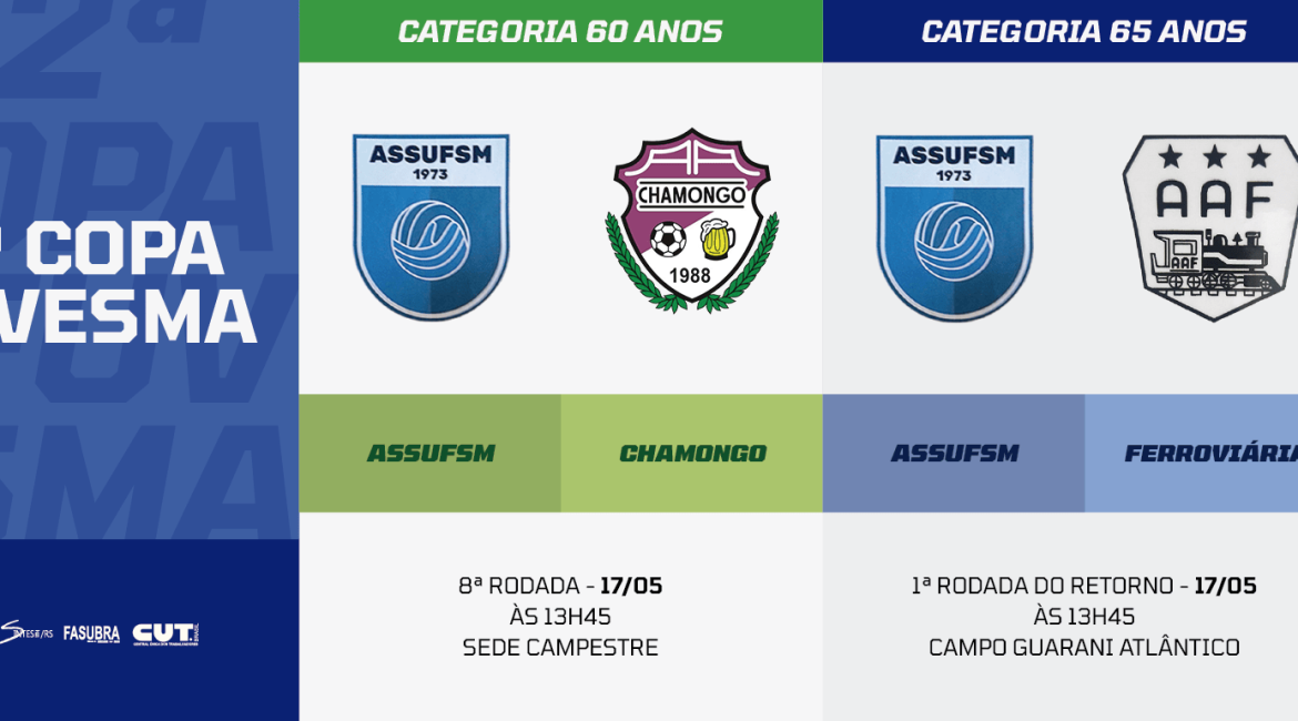 CATEGORIA 60 ANOS – 8° Rodada HORA: 13h15 LOCAL: Sede Campestre ASSUFSM X CHAMONGO CATEGORIA 65 ANOS – 1° Rodada do Returno HORA: 13h45 LOCAL: Campo Guarani Atlântico ASSUFSM X FERROVIÁRIA Na 7° rodada, do dia 10/05, a categoria 60 anos, o adversário venceu a Assufsm, por 1X2 e a categoria 65 anos, a Assufsm venceu o adversário por 4X0. TAE, participe das atividades da sua categoria!