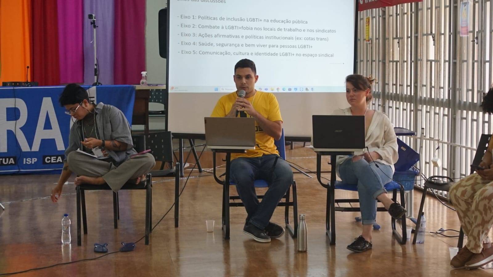 A mesa de abertura contou com a presença de nomes importantes da coordenação da FASUBRA. Representando a Coordenação LGBT da entidade, participaram André Nascimento e Luar Santana. Também compuseram a mesa Ivanilda Reis, Melissa Campos e Tereza Fuji, da Coordenação Geral da FASUBRA e Lucimara da Silva da Cruz, coordenadora de comunicação da Fasubra (veja a notícia completa aqui). Pela manhã, aconteceu uma mesa de debates sobre “Educação anti-LGBTFóbica: desafio nas instituições de ensino e organizações sindicais”, com a presença da produtora cultural, educadora, ativista e política Ruth Venceremos, filiada ao Partido dos Trabalhadores, que destacou a importância da construção coletiva de pautas e prioridades dentro dos movimentos sociais, também esteve presente Toninho Lopes, representante do Sintufes, e representando a Secretaria de Educação Continuada, Alfabetização de Jovens e Adultos, Diversidade e Inclusão (Secadi) do Ministério da Educação (MEC), a professora Maraisa Bezerra Lessa (veja a notícia completa aqui). Já de tarde, o período foi dedicado aos Grupos de Trabalho, nos quais participantes discutiram práticas inclusivas e estratégias de ação sindical voltadas à população LGBTI+. As discussões abordaram desafios enfrentados no cotidiano das instituições federais de ensino, propondo ações concretas para o combate à discriminação e a construção de espaços mais seguros e acolhedores. Em seguida, a programação trouxe leveza e expressão corporal com a oficina de dança “Charme” e, para finalizar o dia, o Cine Debate exibiu filmes com temática trans, proporcionando reflexão e diálogo sobre vivências e representações de pessoas trans na sociedade (veja a notícia completa e mais fotos aqui).