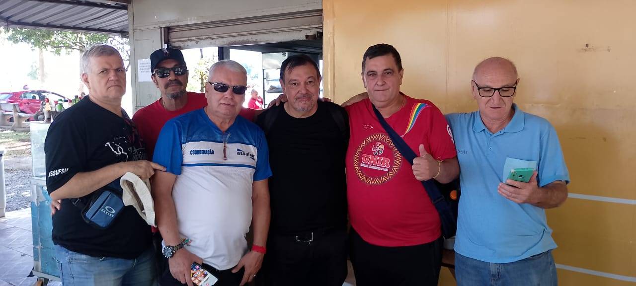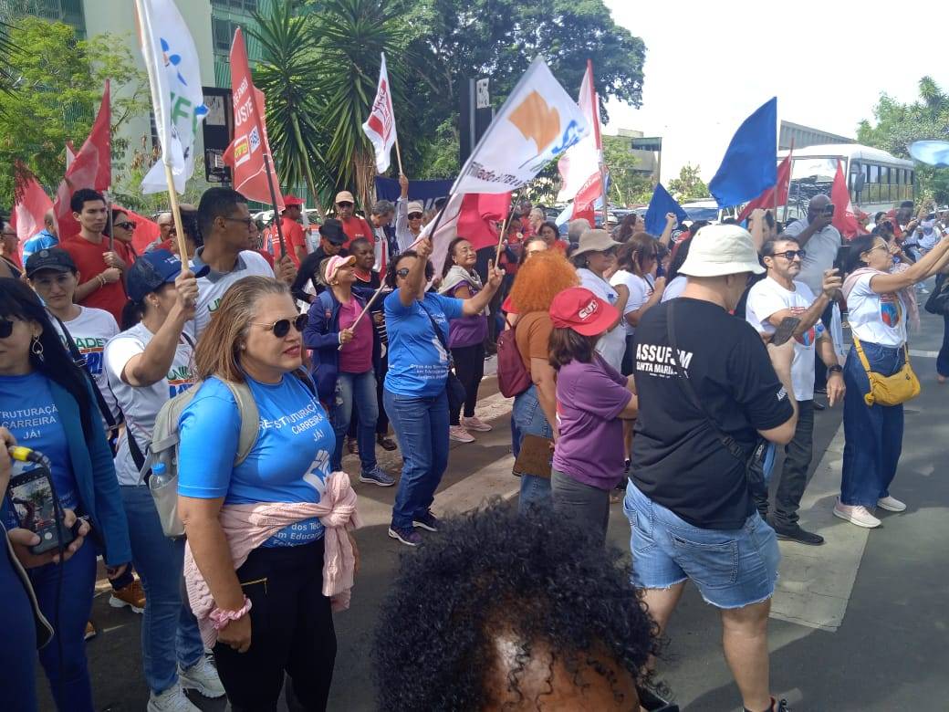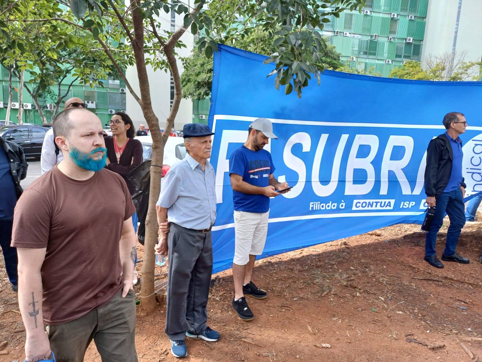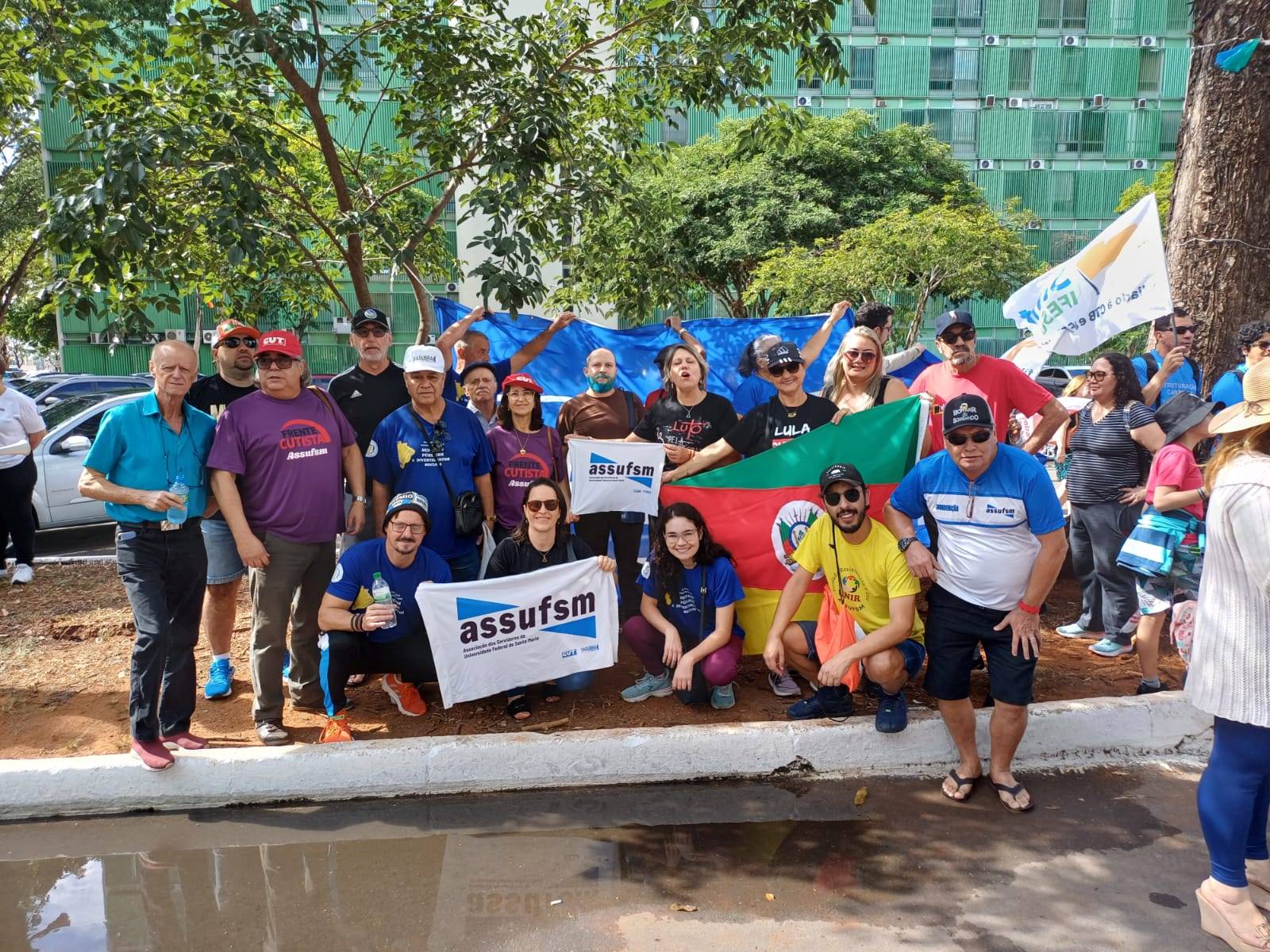 Em frente, ao prédio do MGI, caravaneiros(as) da Assufsm mobilizam-se para pressionar o Governo na negociação.