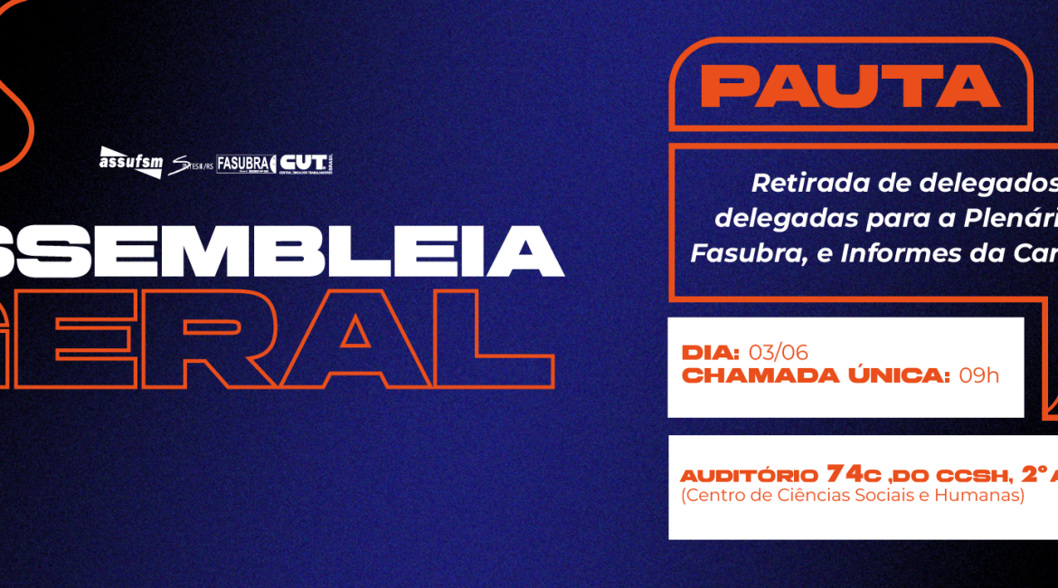 A Assufsm convoca a categoria a participar da Assembleia Geral, a ser realizada na terça-feira (3), no auditório do prédio 74C, no segundo andar do Centro de Ciências Sociais e Humanas (CCSH).