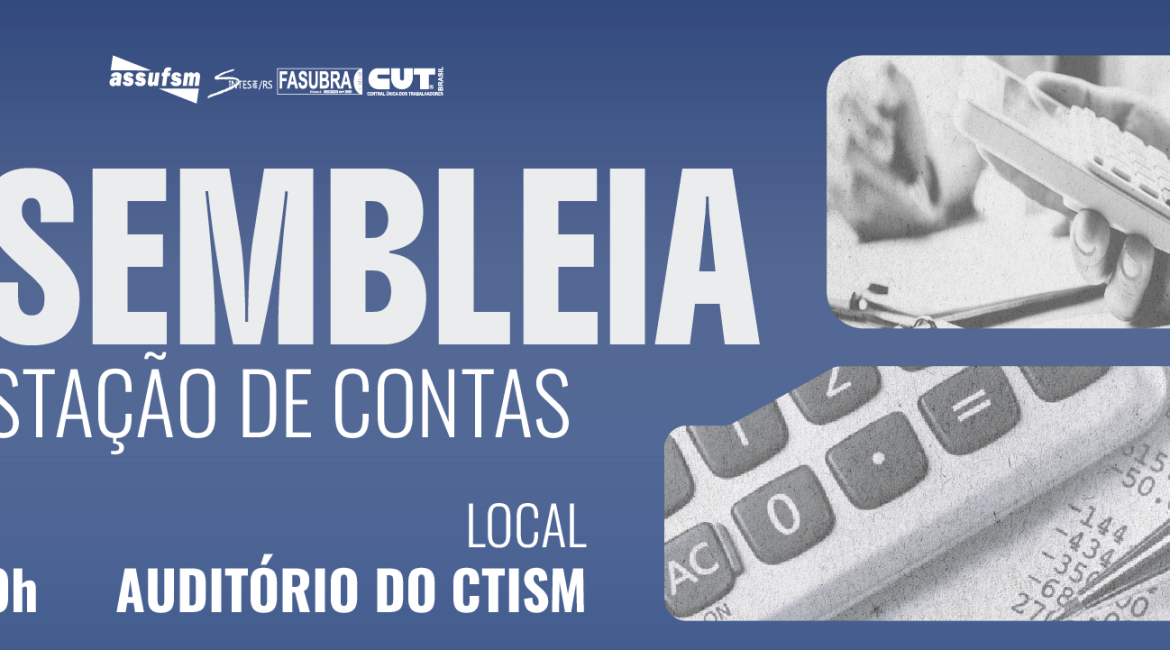 Atenção Técnico Administrativos e Administrativas em Educação da UFSM, filiados e filiadas do sindicato, a Assufsm informa que no dia 11 de junho terá uma Assembleia de Prestação de Contas.