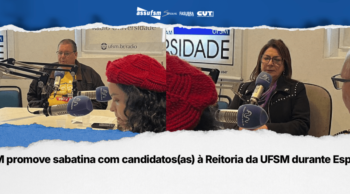 Nesta segunda-feira (09), a ASSUFSM realizou uma sabatina entre os(as) candidatos(as) à reitoria da Universidade Federal de Santa Maria (UFSM), durante o Programa Espaço Sindical, transmitido pela rádio 800 AM, e pelo Youtube do Sindicato. A mediação foi feita pela Coordenadora Geral da ASSUFSM, Alessandra Alfaro, e pelo Coordenador de Esporte, Cultura e Lazer, Paulo Quadrado, ambos representantes do GT Políticas Sociais e Antirracismo da Assufsm.