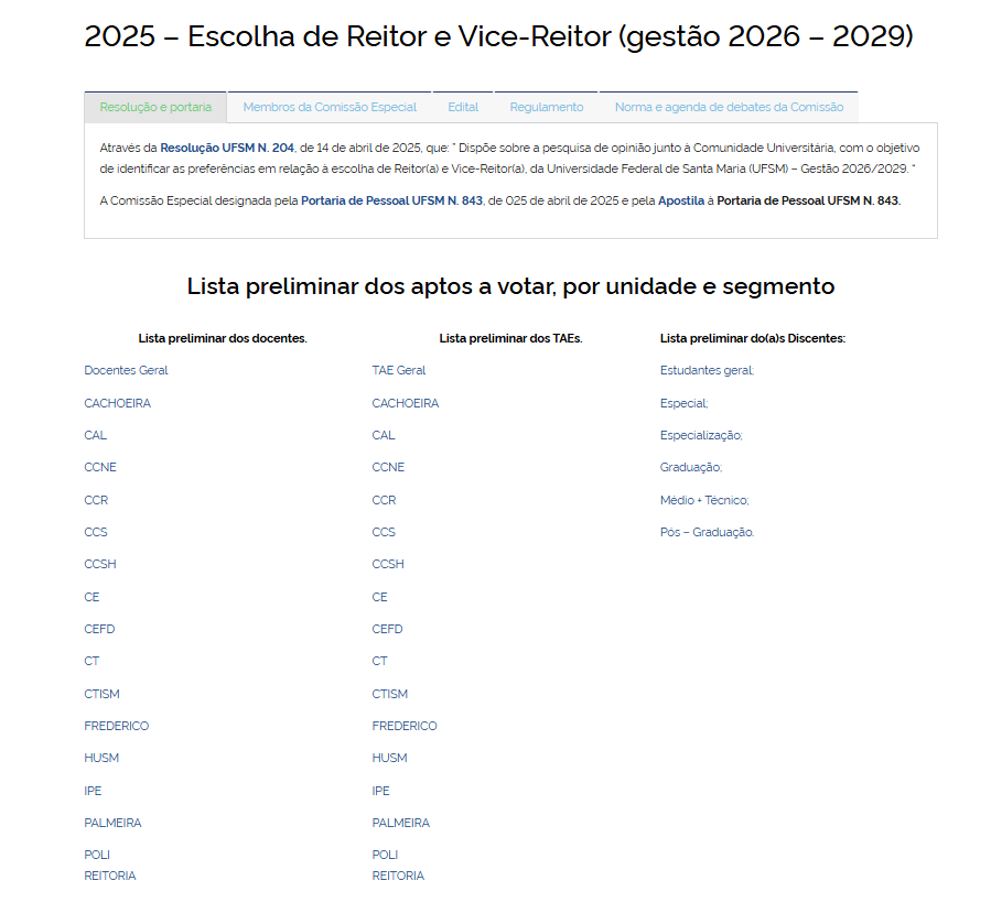 Além dos docentes, técnico-administrativos, estudantes regularmente matriculados em 2025 nos colégios de ensino médio e tecnológico, nos cursos de graduação, especialização, mestrado, doutorado e pós-doutorado, aposentados da UFSM também têm direito ao voto na eleição para a próxima gestão da Universidade.