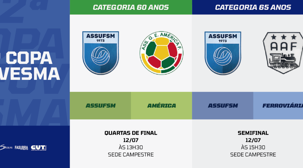 CATEGORIA 60 ANOS – Quartas de Final HORA: 13h30 LOCAL: Sede Campestre ASSUFSM X AMÉRICA CATEGORIA 65 ANOS – Semifinal HORA: 15h30 LOCAL: Sede Campestre ASSUFSM X FERROVIÁRIA No dia 5 de julho, a categoria 60 anos ganhou do adversário Fighera por 3×2, e a categoria 65 ganhou do adversário Cerro Azul por 5×1.TAE, participe das atividades da sua categoria!