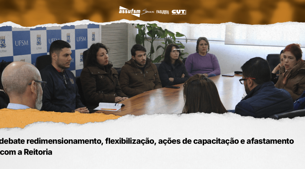 Na manhã desta quinta-feira (31) a coordenação da Assufsm reuniu-se com a gestão da Universidade Federal de Santa Maria (UFSM) para debater o redimensionamento dos técnico-administrativos e administrativas (TAEs) nas unidades, resolução da flexibilização da jornada de trabalho, ações de capacitação em serviço, afastamento para qualificação e o enquadramento dos aposentados(as).