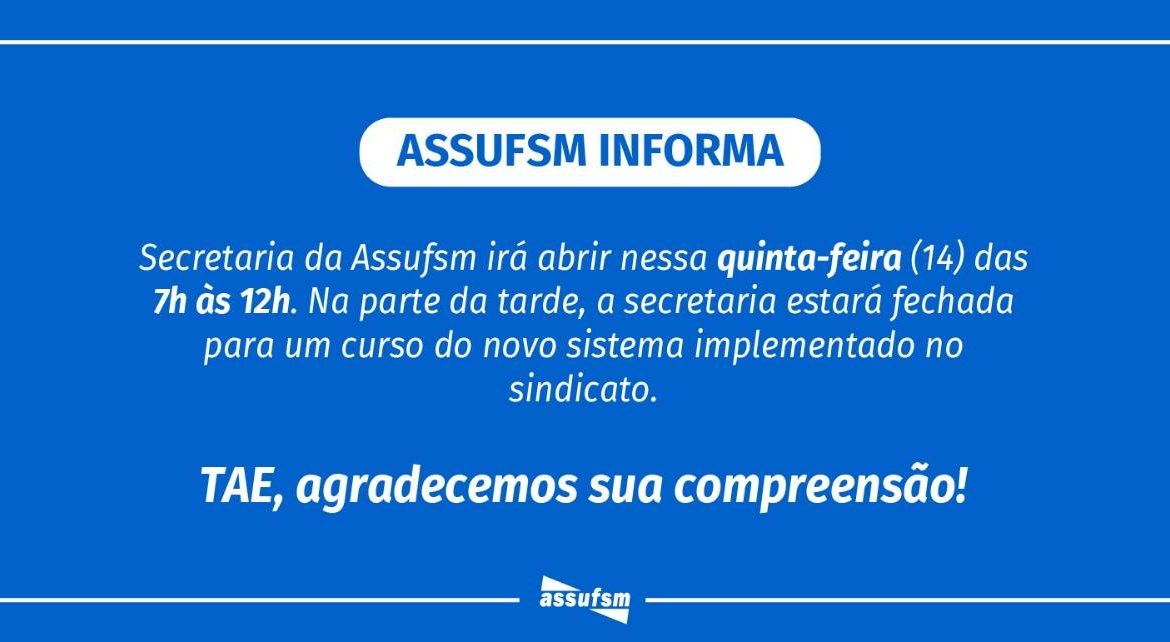 A Secretaria da Assufsm informa que, excepcionalmente nesta quinta-feira, 14 de agosto, o atendimento ao(à) filiado(a) ocorrerá das 7h às 12h.