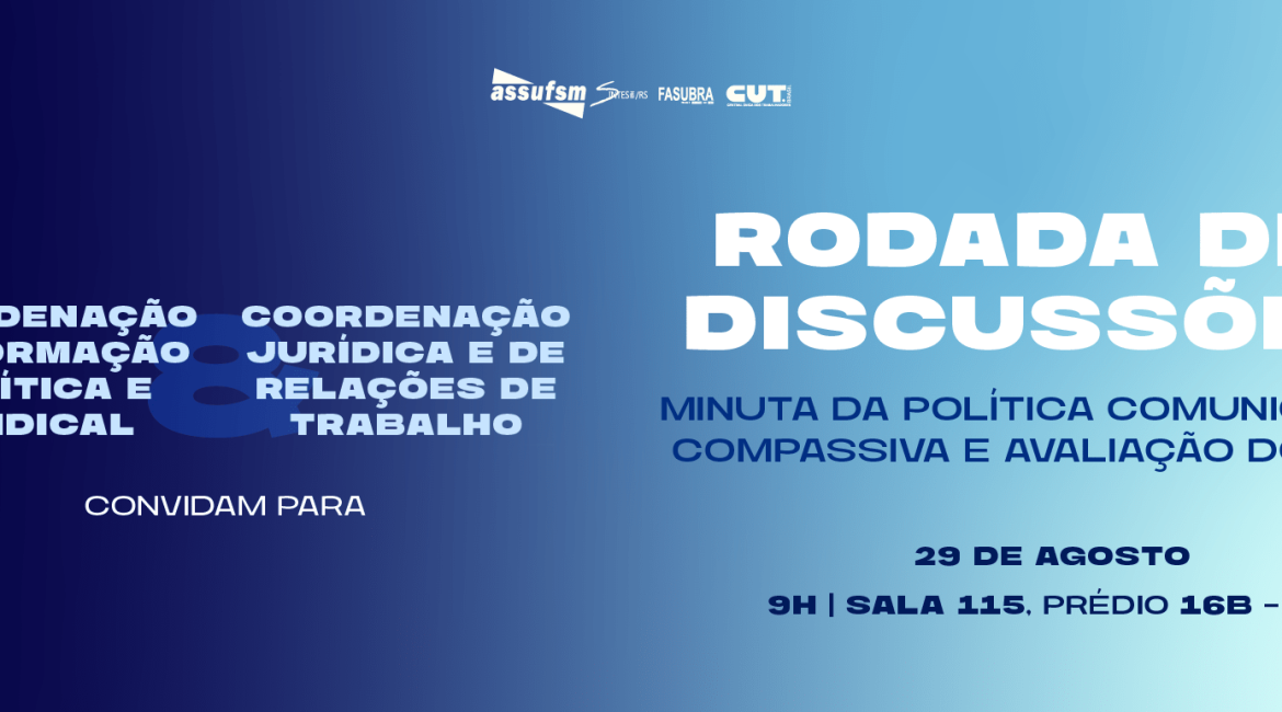 A Coordenação de Formação Política e Sindical e a Coordenação Jurídica e de Relações de Trabalho da ASSUFSM convidam as servidoras e os servidores técnico-administrativos em educação para participarem de uma Rodada de Discussões, que será realizada nesta sexta-feira (29),  às 9h, na Sala 115 do prédio 16B do Centro de Educação. Durante a reunião, estará presente a TAE Márcia Lorentz, representando a PROGEP, para dialogar com a categoria sobre as propostas em discussão.