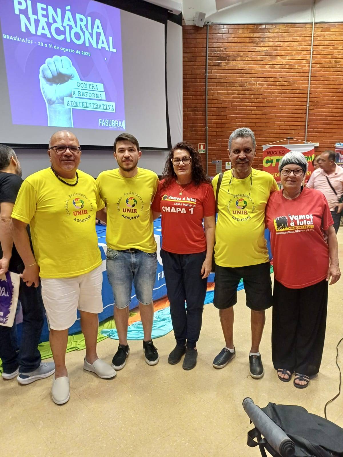 Iniciou nesta sexta-feira (29) em Brasília, a Plenária Nacional da Fasubra. Nos próximos dois dias, serão intensos os debates sobre a conjuntura política e os rumos da luta da categoria. A Assufsm está representada na Plenária pelas delegadas Maria Dalva dos Santos Moraes e Arlete Maria Vieira, do coletivo “Vamos à Luta” e os delegados Guilherme Elwanger (representando a Coordenação da Assufsm), Wilson da Rosa e Paulo Quadrado, do coletivo “Unir”. Os nomes foram escolhidos a partir da votação na Assembleia realizada no dia 13 de agosto, no auditório do Colégio Politécnico.
