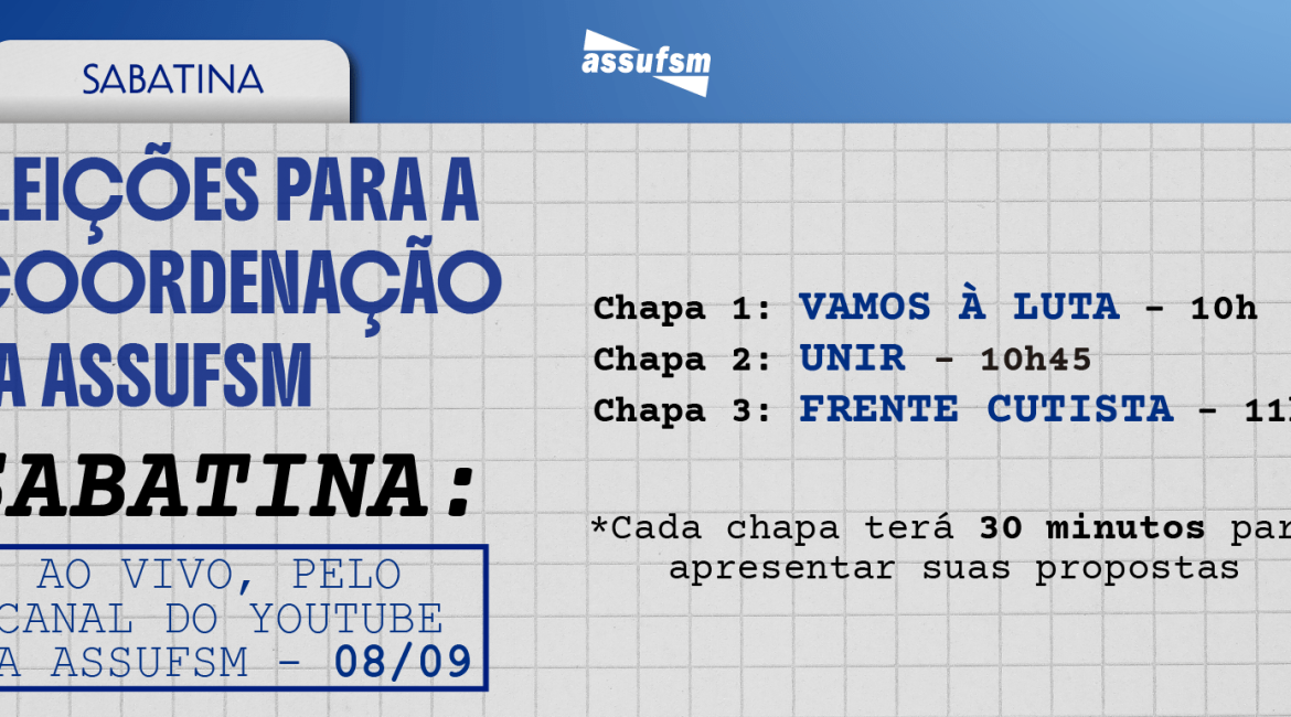 Cada chapa estará com dois representantes e terá 30min para a apresentação de suas propostas. A Chapa 1 (Vamos à Luta) iniciará às 10h, a Chapa 2 (Unir) iniciará às 10h45min e a Chapa 3 (Frente Cutista) iniciará às 11h30min. A sabatina será mediada pelo Setor de Comunicação da Assufsm, com a transmissão direta no canal do YouTube do sindicato.