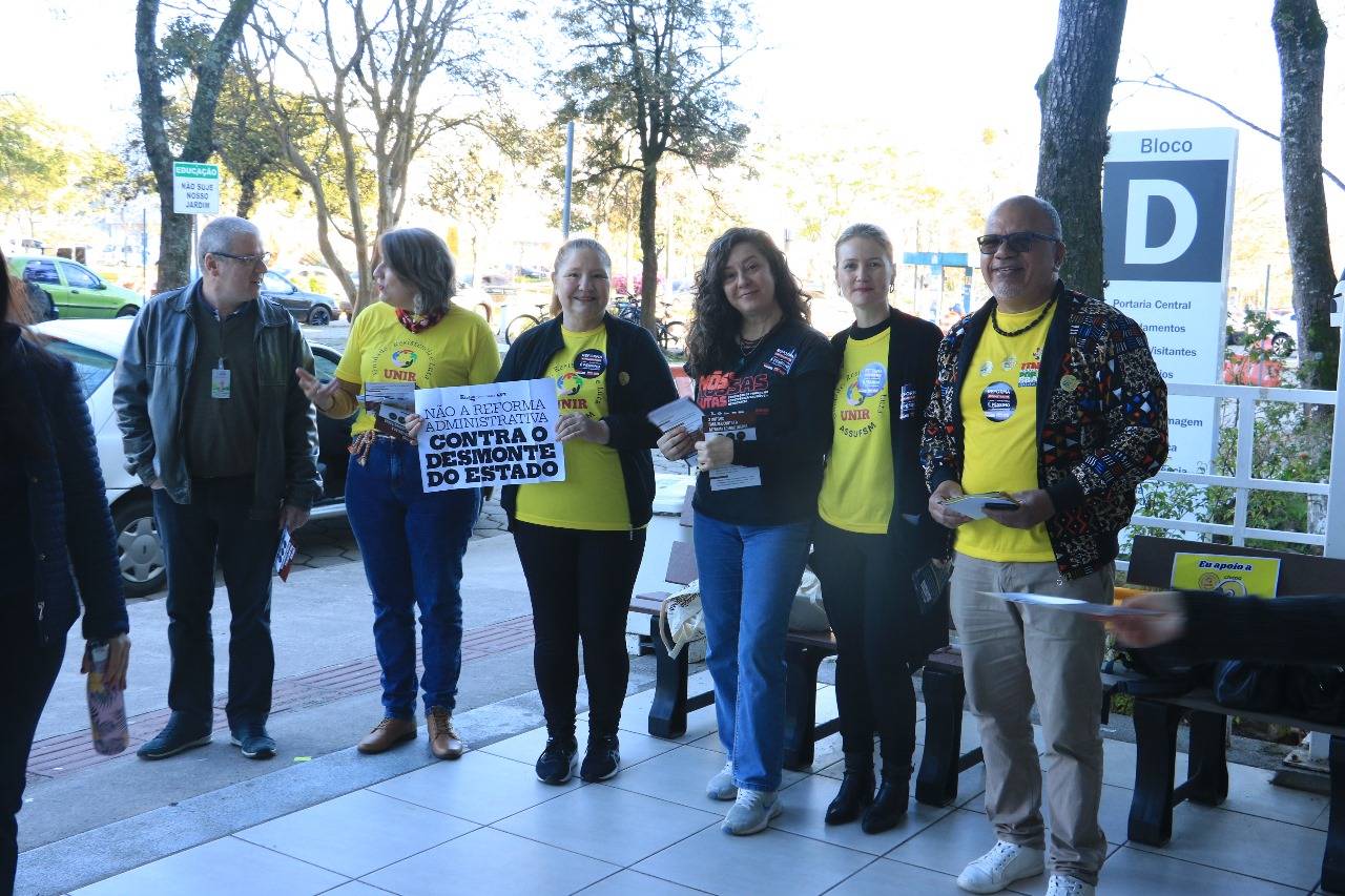 Na manhã desta quarta-feira (10), primeiro dia da paralisação de 48h orientada pela FASUBRA e deliberada pela Assembleia da categoria, TAEs reuniram-se em frente ao Hospital Universitário de Santa Maria (HUSM) para uma ação de mobilização contra a Reforma Administrativa.