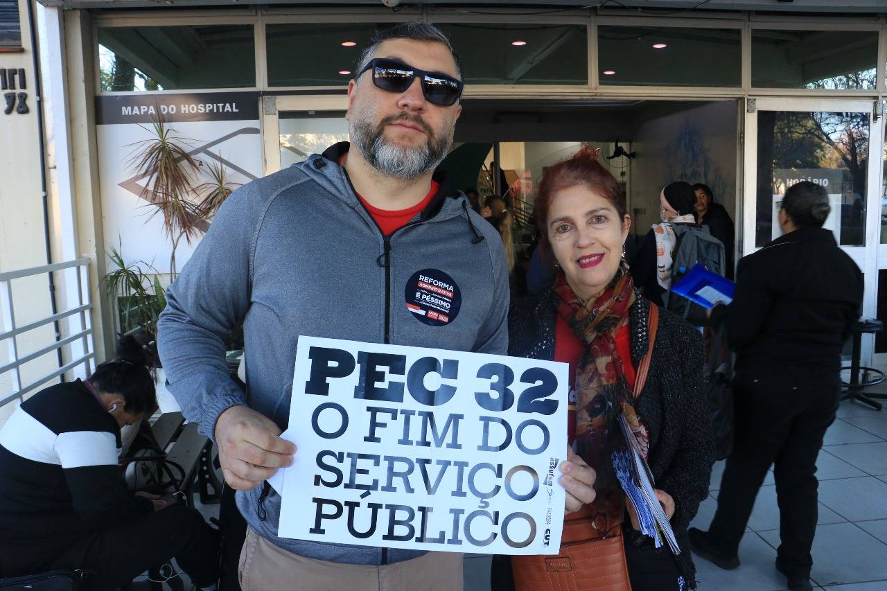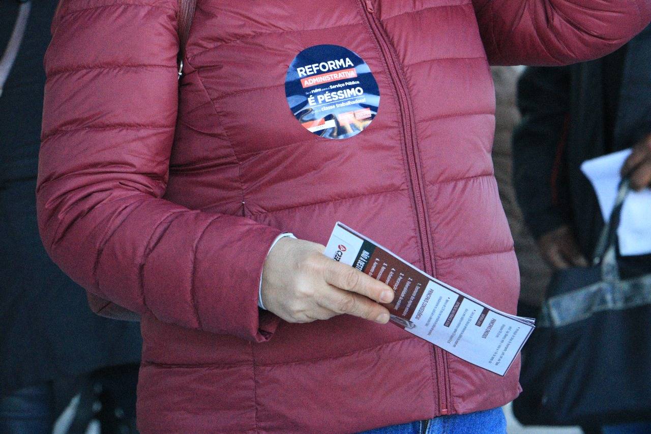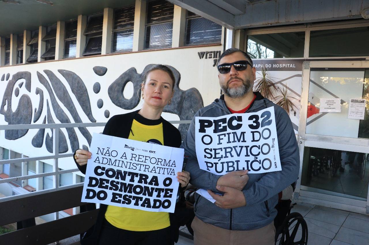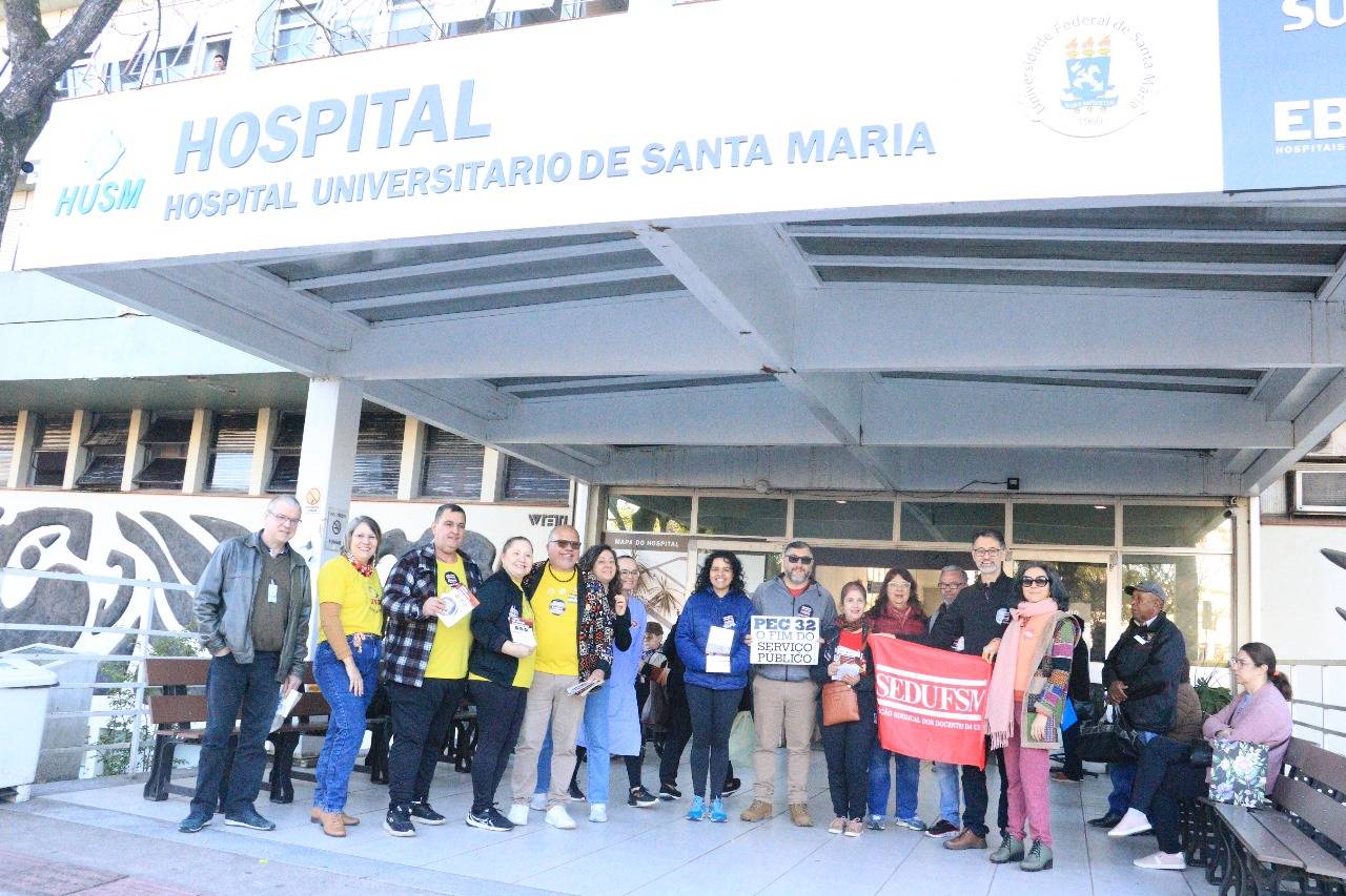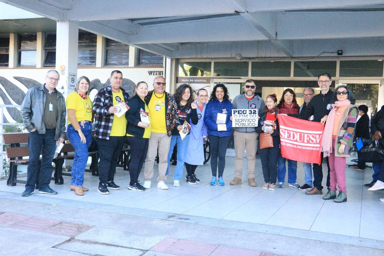 A atividade buscou dialogar diretamente com pacientes, trabalhadores/as e a comunidade em geral, chamando a atenção para os graves impactos que a Reforma Administrativa, em tramitação no Congresso Nacional, pode trazer caso seja aprovada. Durante a mobilização, Sedufsm e Assufsm distribuíram materiais impressos, explicando de que forma a proposta ameaça direitos sociais e coloca em risco serviços públicos essenciais, como saúde e educação. Os materiais também foram fixados na parada de ônibus, a fim de alcançar ainda mais visualização da comunidade.