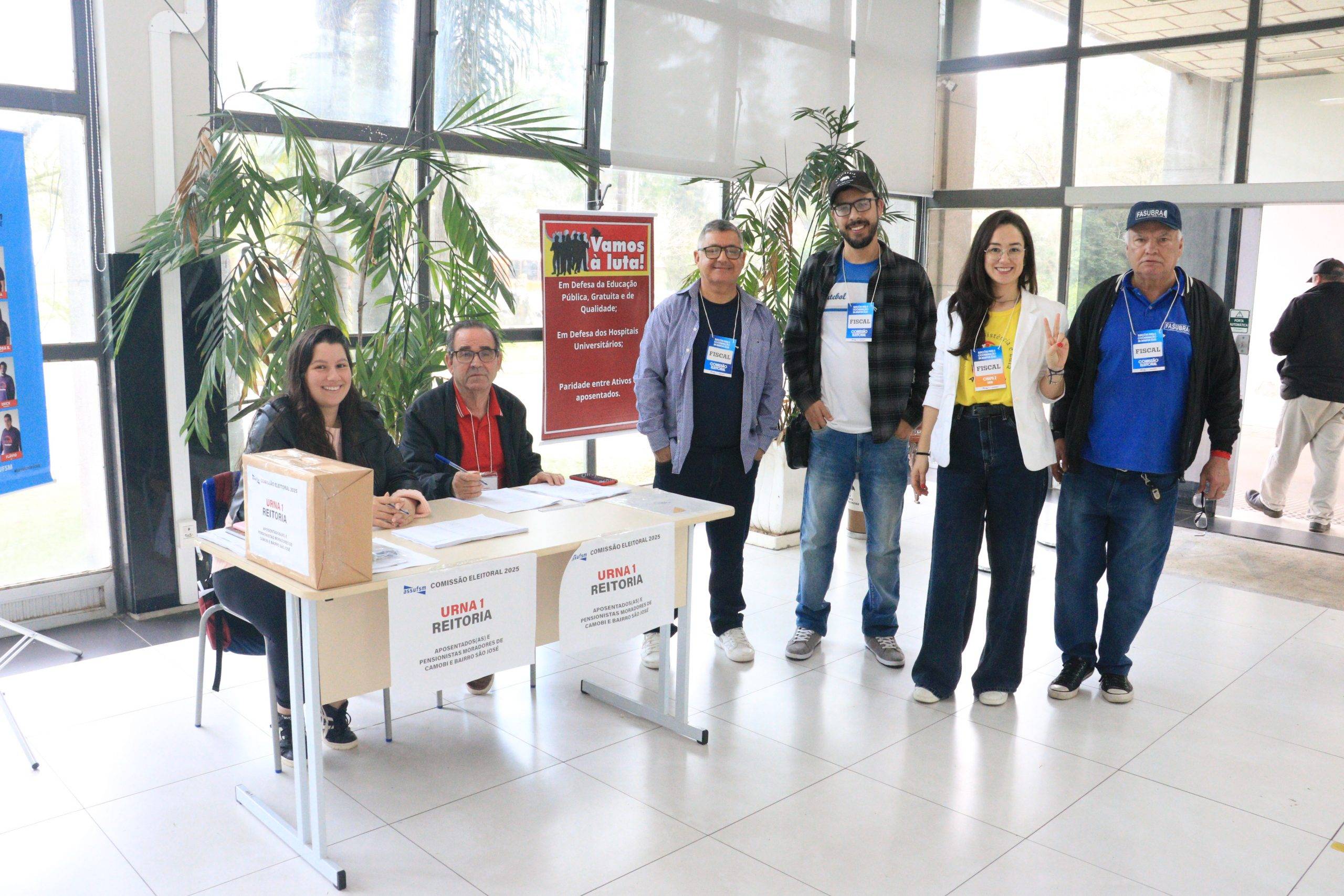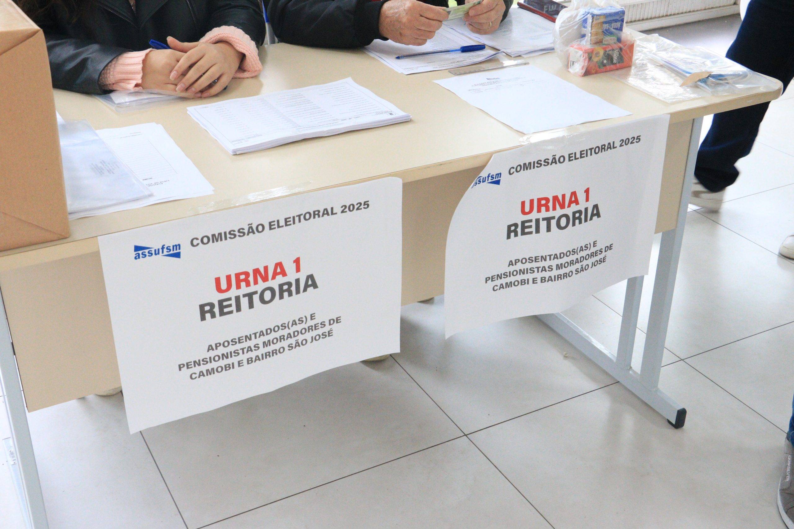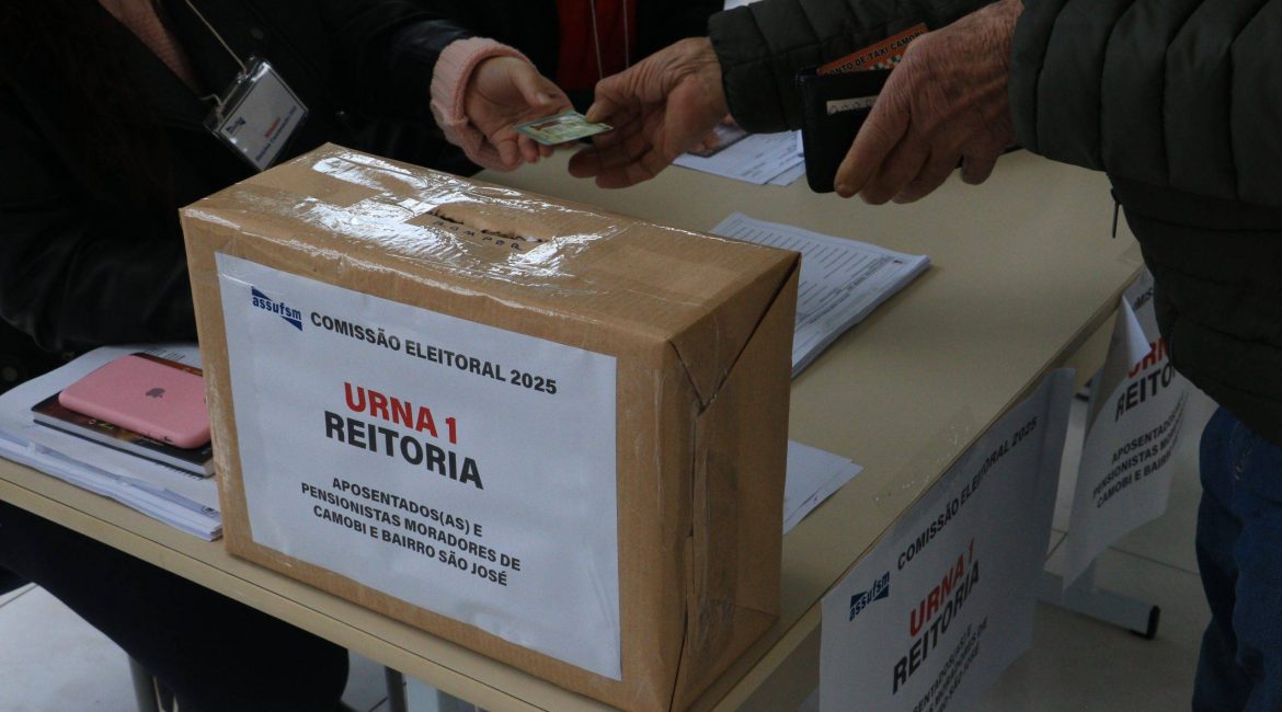 A votação presencial para aposentados(as) e pensionistas ocorre no prédio da Reitoria (urna 1), no campus sede, e no prédio da Antiga Reitoria (urna 2), no centro de Santa Maria. A lisura do processo é garantida por fiscais de cada chapa e pela Comissão Eleitoral, composta pelos TAEs Ciro Oliveira, Rogério de Quadros e Eduíno Simões.