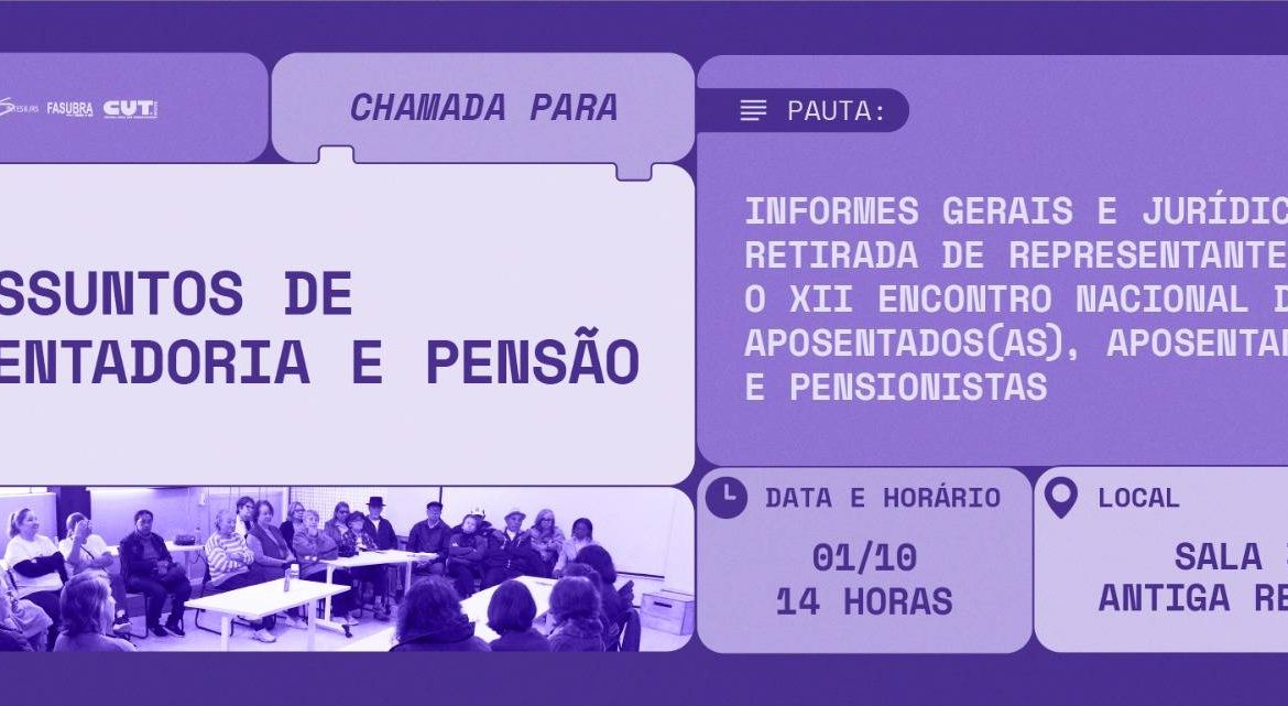Em pauta estão informes gerais e jurídicos, com o Advogado Heverton Padilha da Wagner Advogados Associados e a retirada de representantes para o XII Encontro Nacional de Aposentados(as), Aposentandos(as) e Pensionistas.