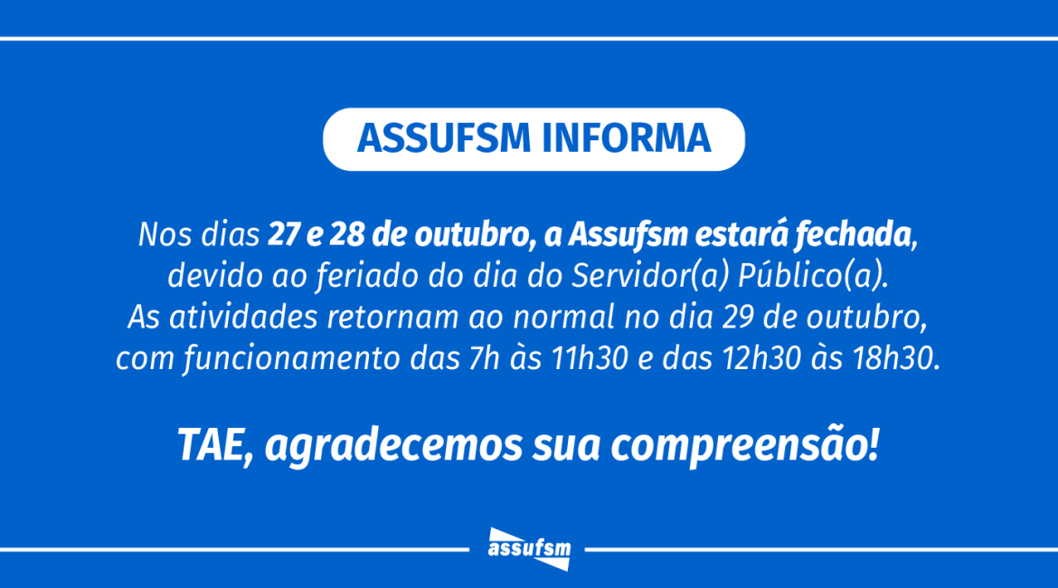 Nos dias 27 e 28 de outubro, a Assufsm estará fechada, devido ao feriado do dia do Servidor(a) Público(a).