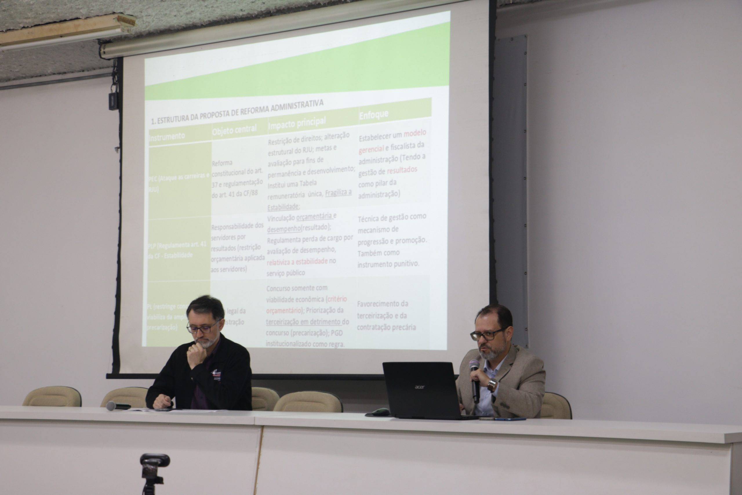 Por fim, o estudante Luiz Boneti, representante do Diretório Central dos Estudantes (DCE), destacou o avanço do neoliberalismo e das políticas de desmonte do serviço público. Ele defendeu a necessidade de construir uma resposta clara e acessível à sociedade em defesa de um projeto de serviço público alinhado aos interesses da classe trabalhadora e estudantil, pautado em ampliação e qualidade do atendimento e mais servidores públicos.