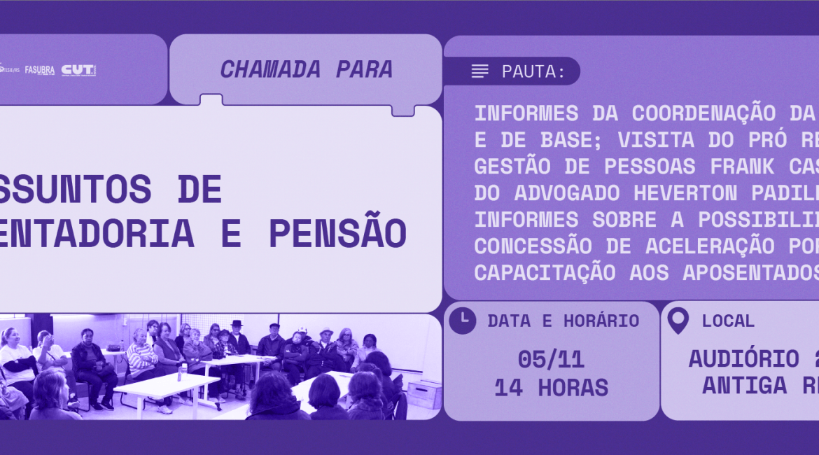 Em pauta estão Informes da Coordenação da Assufsm e de base; visita do Pró Reitor de Gestão de Pessoas Frank Casado e do Advogado Heverton Padilha para informes sobre a possibilidade de concessão de Aceleração por Capacitação aos Aposentados(as).