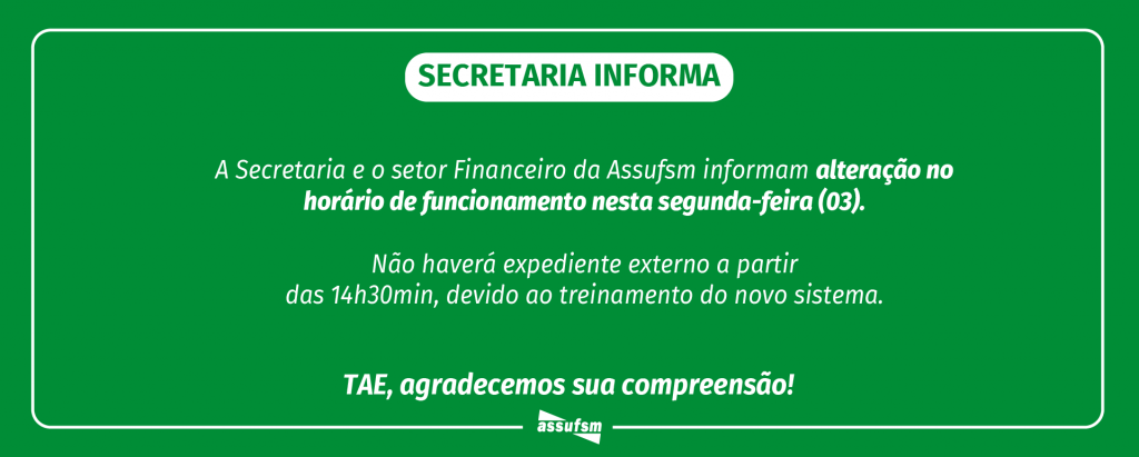 Nesta segunda-feira (03), a Secretaria e o setor Financeiro da Assufsm estarão fechados para atendimento externo, a partir das 14h30min. A equipe estará passando por treinamento do novo sistema operacional.