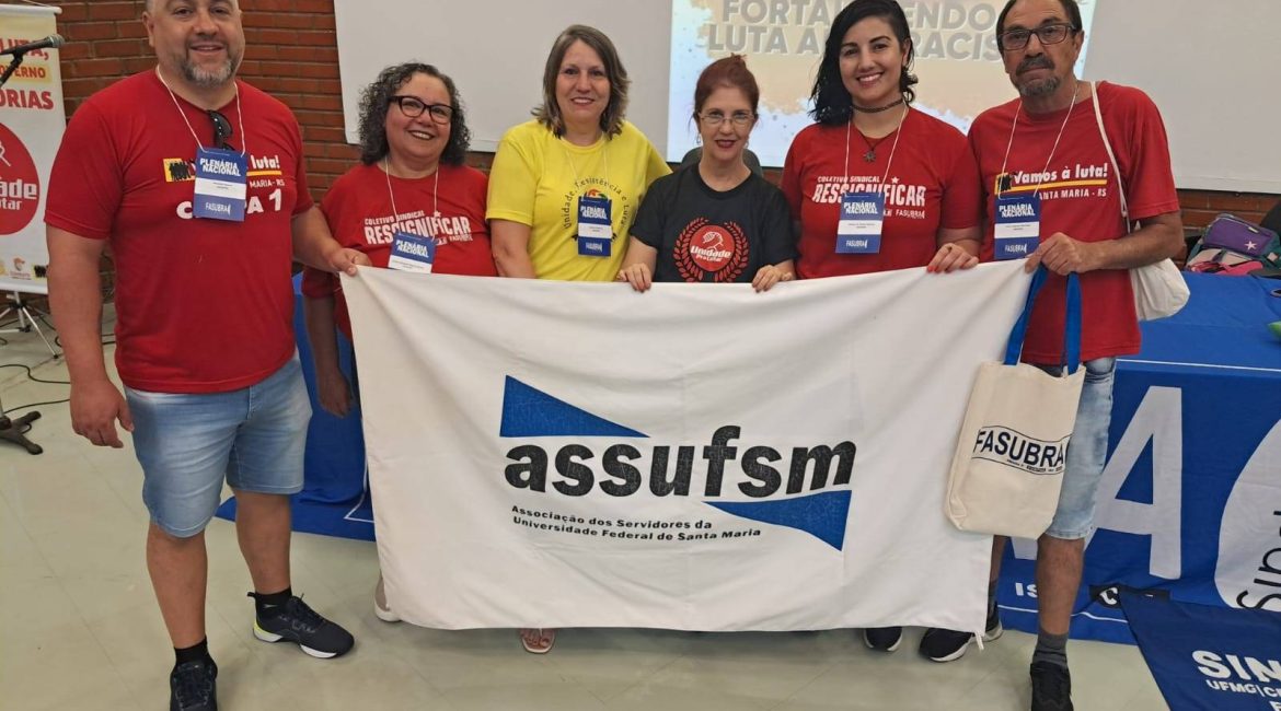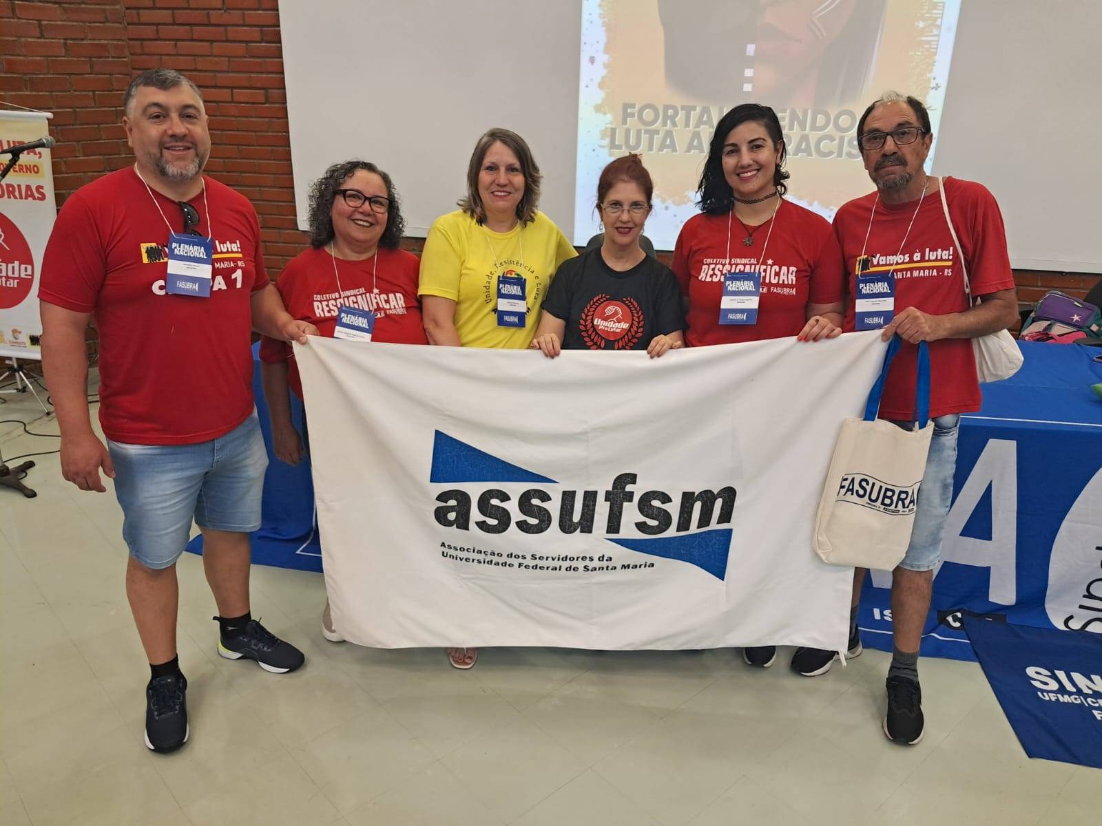 Estiveram representando a Assufsm na Plenária da Fasubra, os(as) delegados(as) eleitos(as) na última Assembleia Geral (veja aqui): o Coordenador de Comunicação Maurício Severo e o TAE César Machado pelo Coletivo Vamos à Luta; Coordenadora Financeira e Patrimonial Rosimar Rubenich pela Chapa Unir; e a Coordenadora Jurídica e de Relações de Trabalho Gláucia Tassinari e a Coordenadora de Formação Política e Sindical Sandra Rocha pela Chapa Ressignificar. Também esteve presente a Coordenadora Geral da Fasubra e da Assufsm Loiva Chansis.