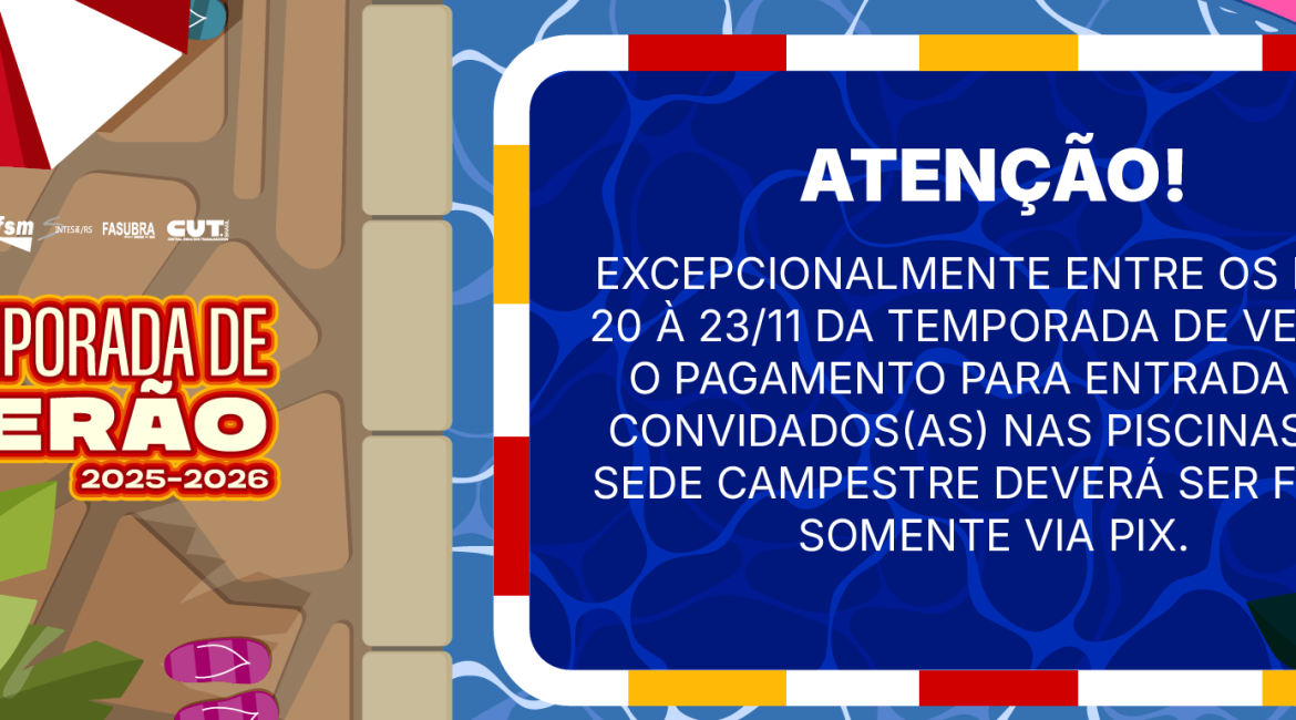 ‍♀️ Excepcionalmente nesses primeiros dias da Temporada de Verão, entre os dias 20 e 23 de novembro, o pagamento para entrada de convidados(as) nas piscinas da Sede Campestre deverá ser feito somente via pix. Não serão aceitos pagamentos via cartão de débito.