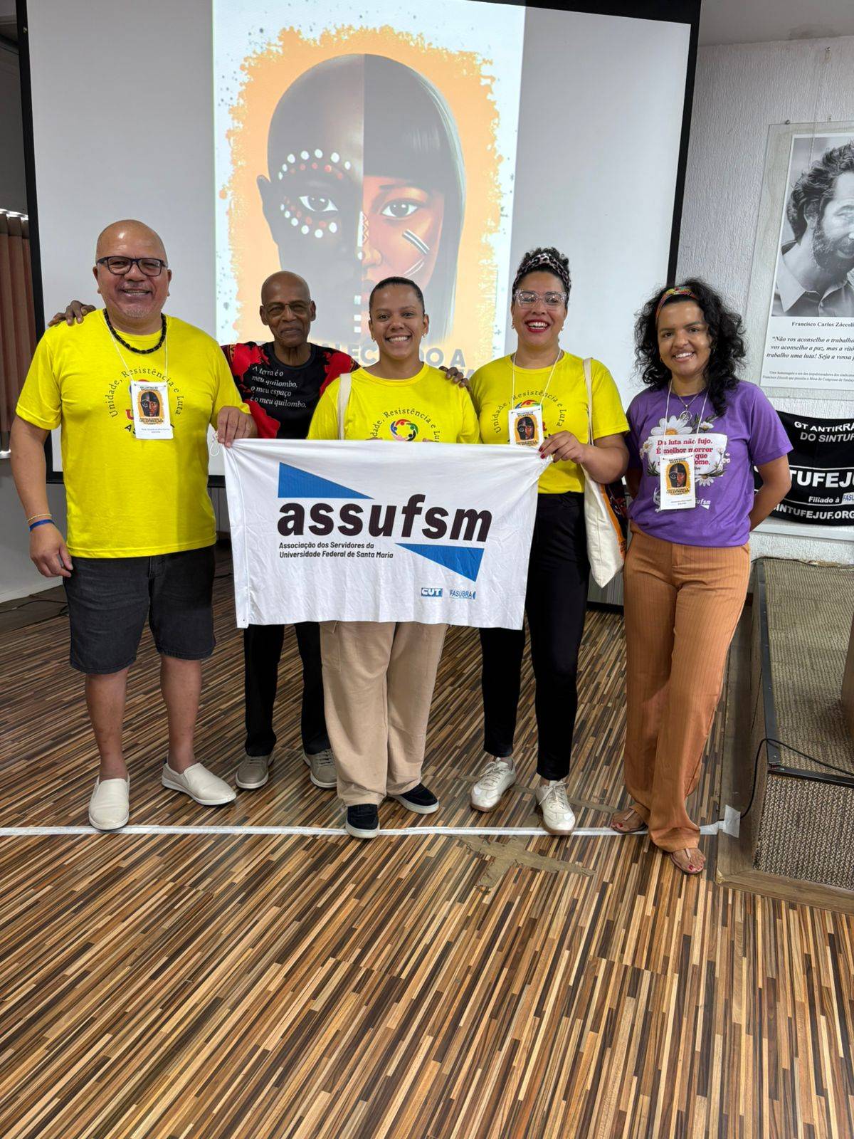 De 22 a 24 de novembro, o GT Políticas Sociais e Antirracistas da Assufsm está em Brasília, para debater sobre as lutas do povo negro. A comitiva que viajou é composta pela Coordenadora Jurídica e de Relações de Trabalho Jiele Silva, a Coordenadora de Secretaria Jaíne Vasconcellos, o Coordenador de Esporte Cultura e Lazer Paulo Quadrado, a TAE ativa da base Alessandra Alfaro e o TAE aposentado de base Antoninho Ezequiel.