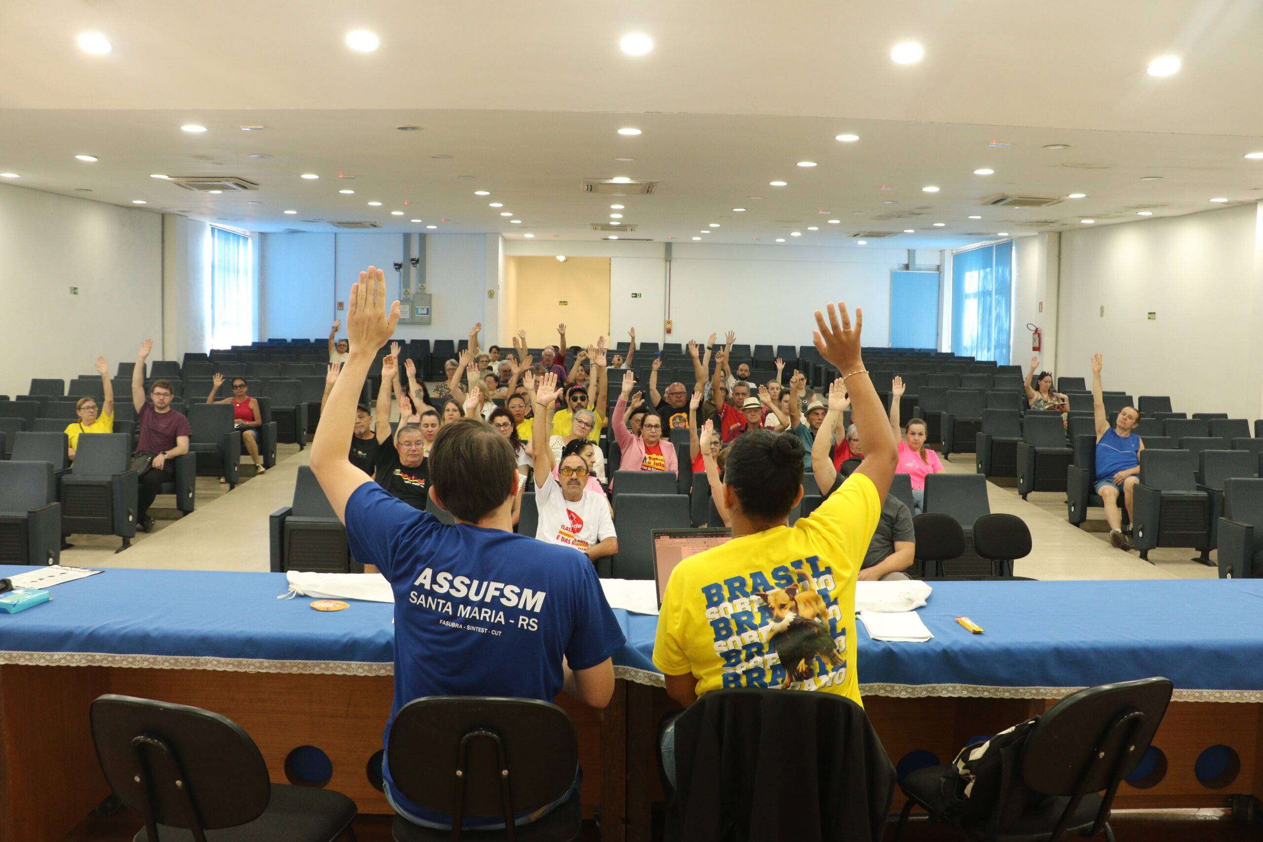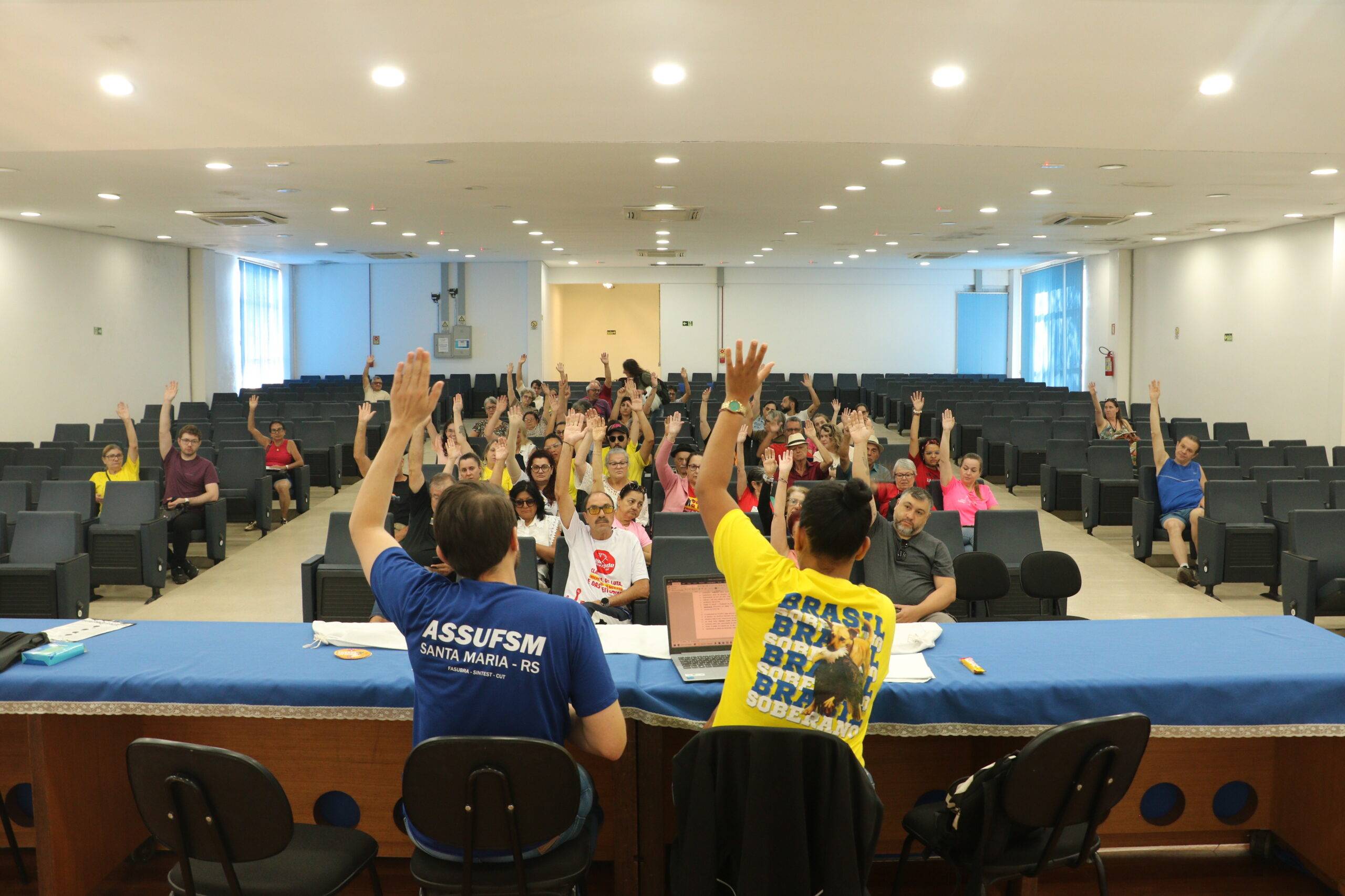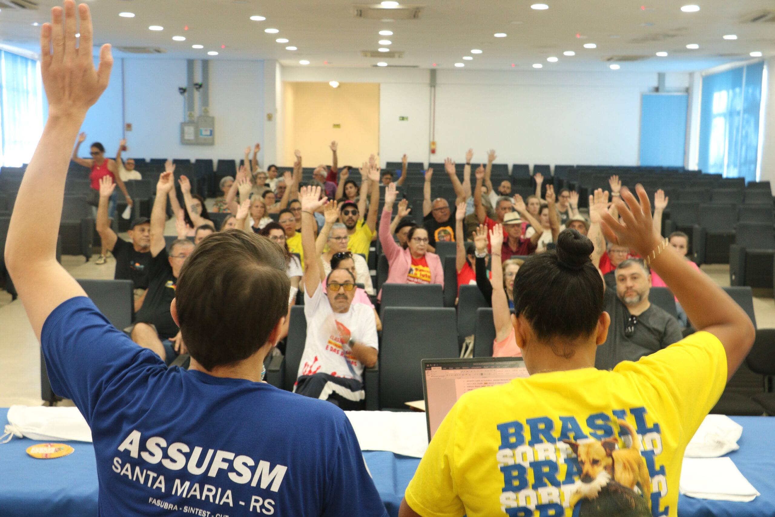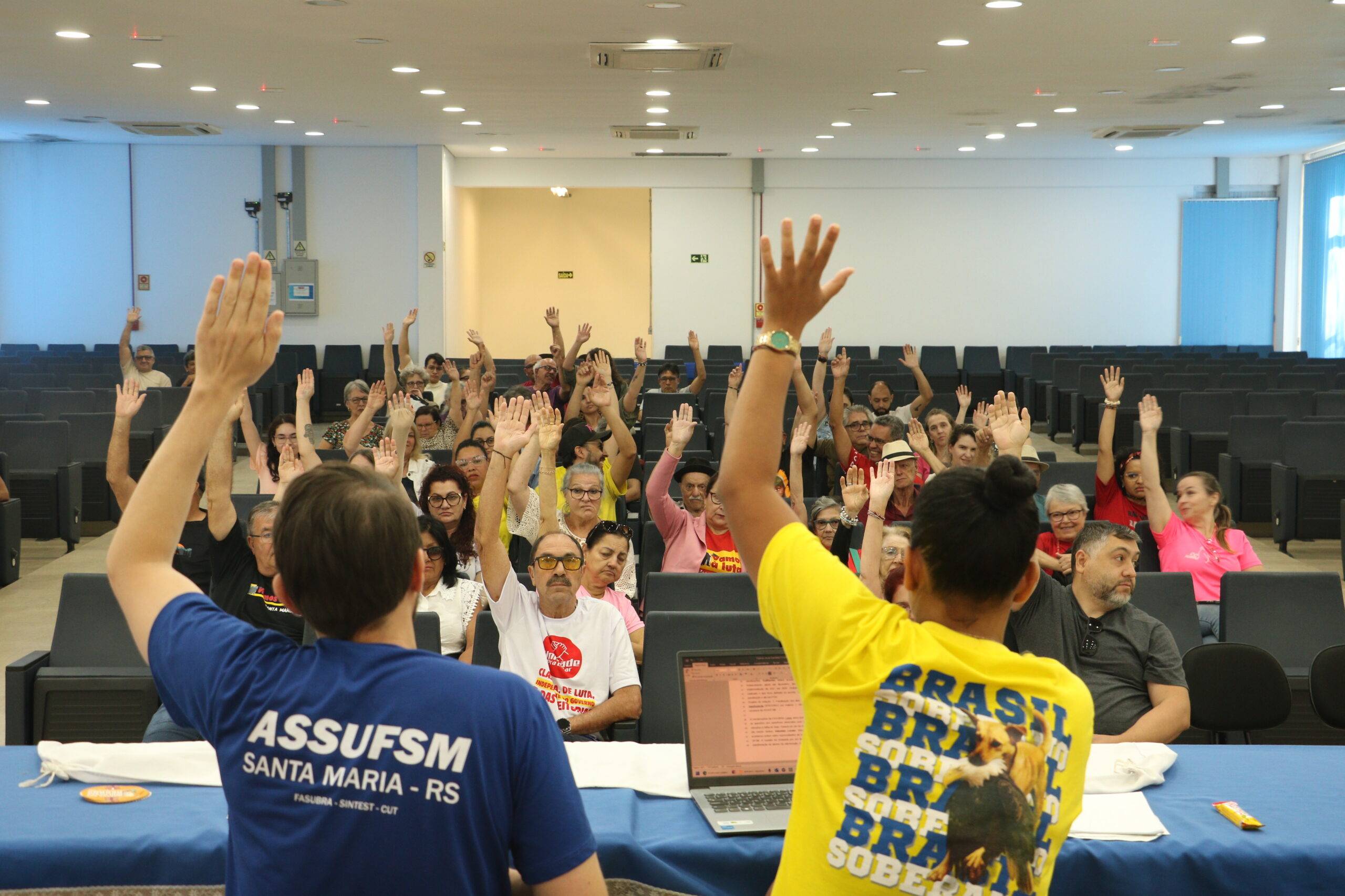 Na manhã dessa quinta-feira (27), a base de Técnico Administrativos(as) em Educação da Universidade Federal de Santa Maria (TAES/UFSM) esteve reunida no Auditório Wilson Aita, no Centro de Tecnologia para debater importantes pautas para a categoria: escolha da delegação para a Plenária Online da FASUBRA, que ocorrerá em dezembro; paralisação de 48h nos dias 3 e 4 de dezembro, chamada pela FASUBRA e caravana a Porto Alegre para ato unificado, também chamado pela FASUBRA. Além disso, foi incluido na pauta da Assembleia a aprovação de uma Moção de Apoio à luta dos Municipários de Santa Maria, contra a Reforma da Previdência.
