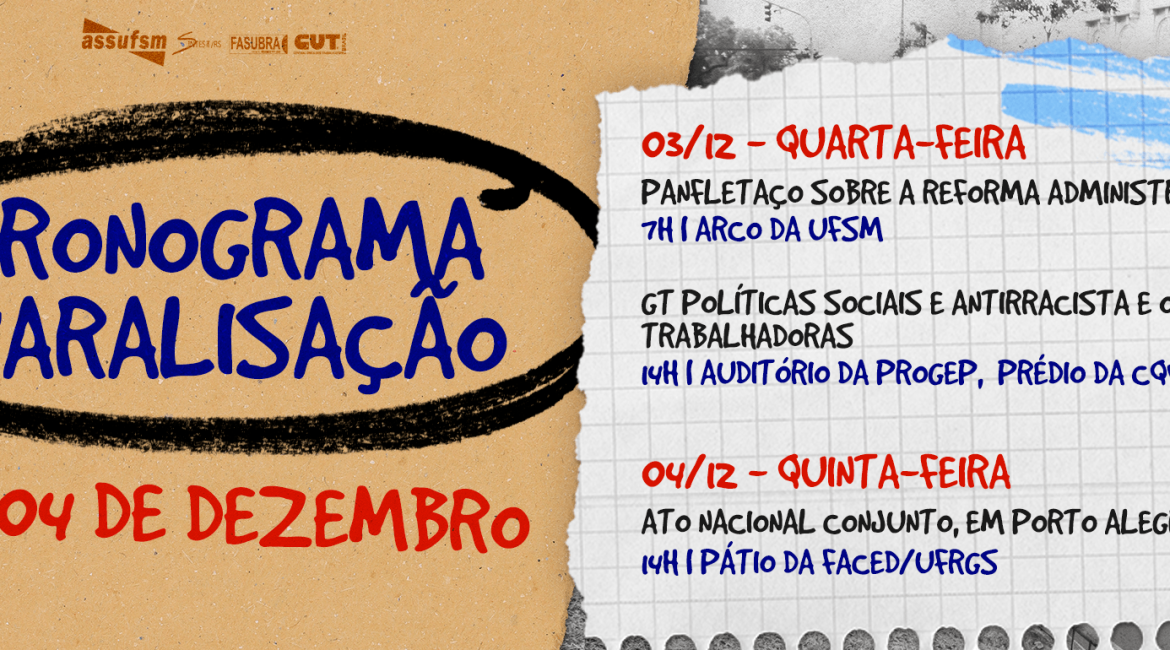 Nos dias 3 e 4 de dezembro a Assufsm realiza atividades de mobilização nos dias de paralisação, chamada pela FASUBRA, contra a Reforma Administrativa e pelo cumprimento do Acordo de Greve 2024.