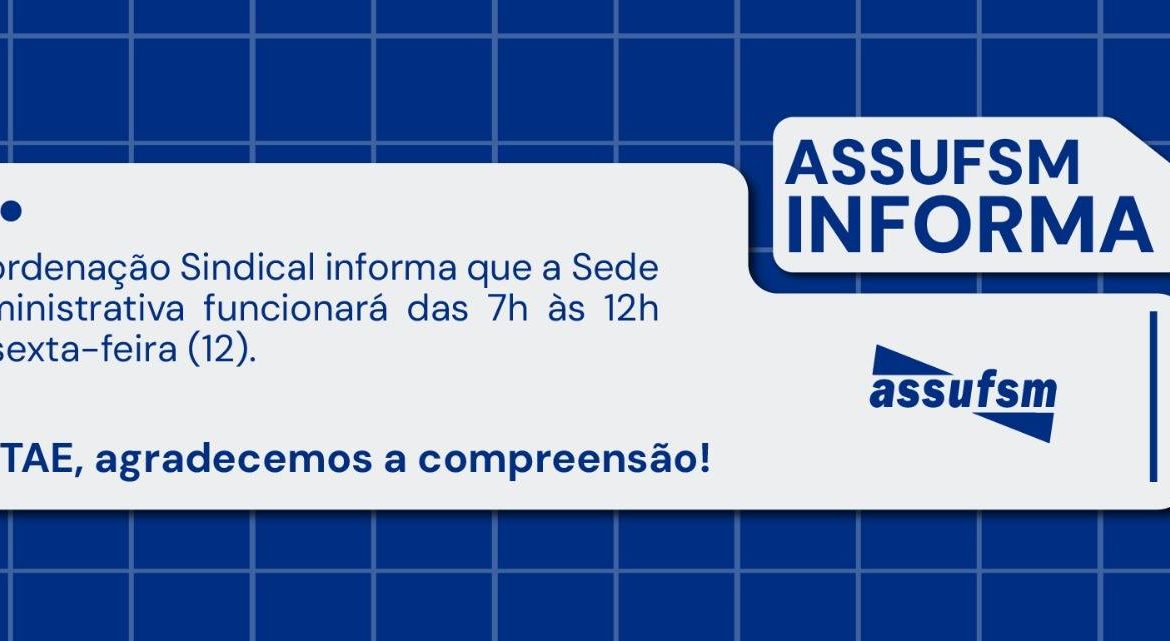 Atenção Técnico Administrativo(a) em Educação, a Assufsm informa que no dia 12 de dezembro, sexta-feira, a Sede Administrativa, localizada na Rua Erly de Almeida Lima, 680, no bairro Camobi, irá funcionar com horário diferenciado, das 7h às 12h, devido a confraternização de final de ano dos funcionários(as) do sindicato.