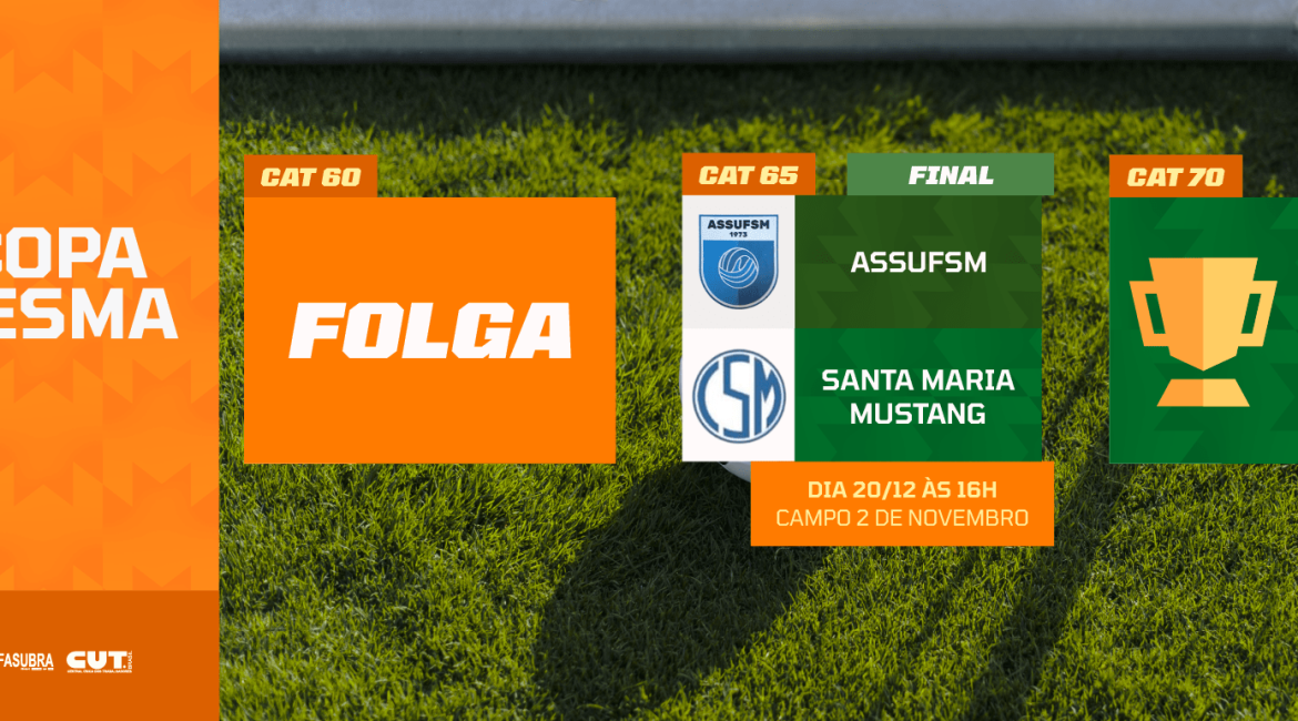 ⚽ Mais um time será campeão da Copa Afuvesma no próximo sábado (20). A categoria 65 anos da Assufsm enfrenta o time Santa Maria/Mustang, no Campo do 2 de Novembro, a partir das 16h.