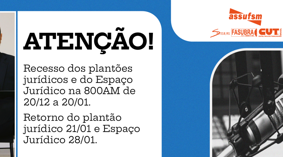 Quanto aos plantões jurídicos junto à Assufsm (incluso o HUSM) e o Espaço Jurídico, na 800AM, o período de recesso será maior, de 20/12/2025 à 20/01/2026. Os plantões presenciais no sindicato retornam no dia 21/01/2026. Já os informes jurídicos retornam no dia 28/01/2026.