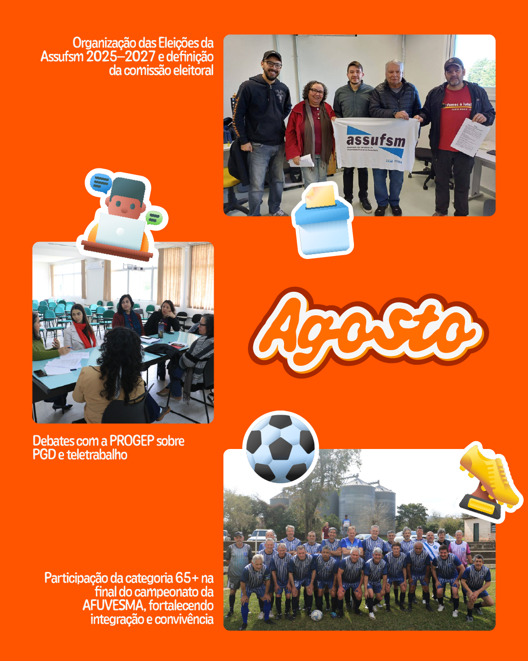 Além das pautas políticas e organizativas, agosto contou com momentos de esporte, cultura e lazer, com a participação da categoria 65+ da Assufsm na final do campeonato da AFUVESMA, fortalecendo a convivência, a integração e a valorização dos(as) filiados(as).