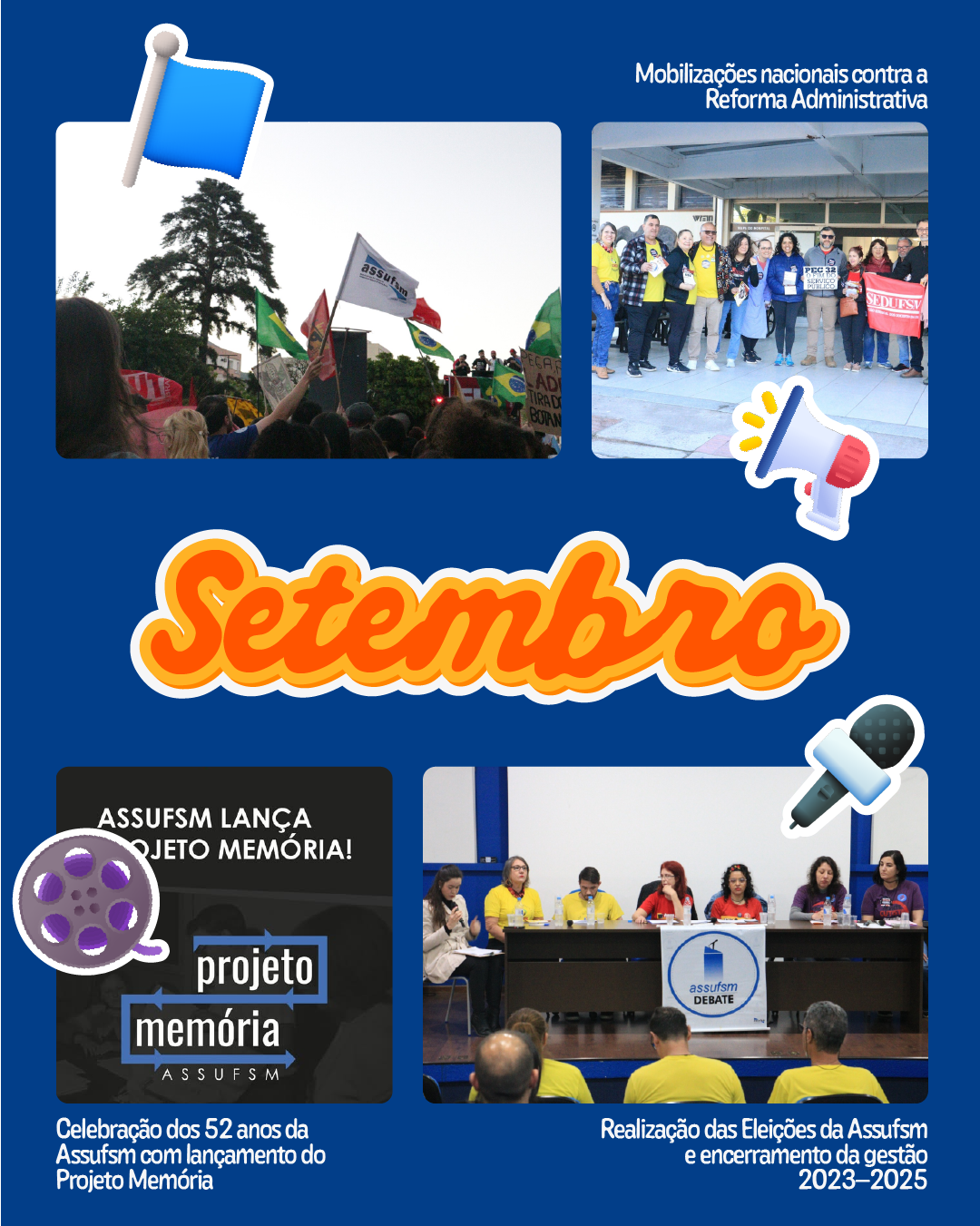 Setembro foi marcado por forte mobilização nacional, processos democráticos e valorização da memória sindical. A Assufsm esteve presente em Brasília, junto a entidades da educação federal, intensificando as ações contra a Reforma Administrativa, além de promover mobilizações locais durante a paralisação de 48h, com atos públicos, diálogo com a comunidade no HUSM e ações solidárias, como a doação de sangue, reafirmando a defesa do serviço público aliada à responsabilidade social.