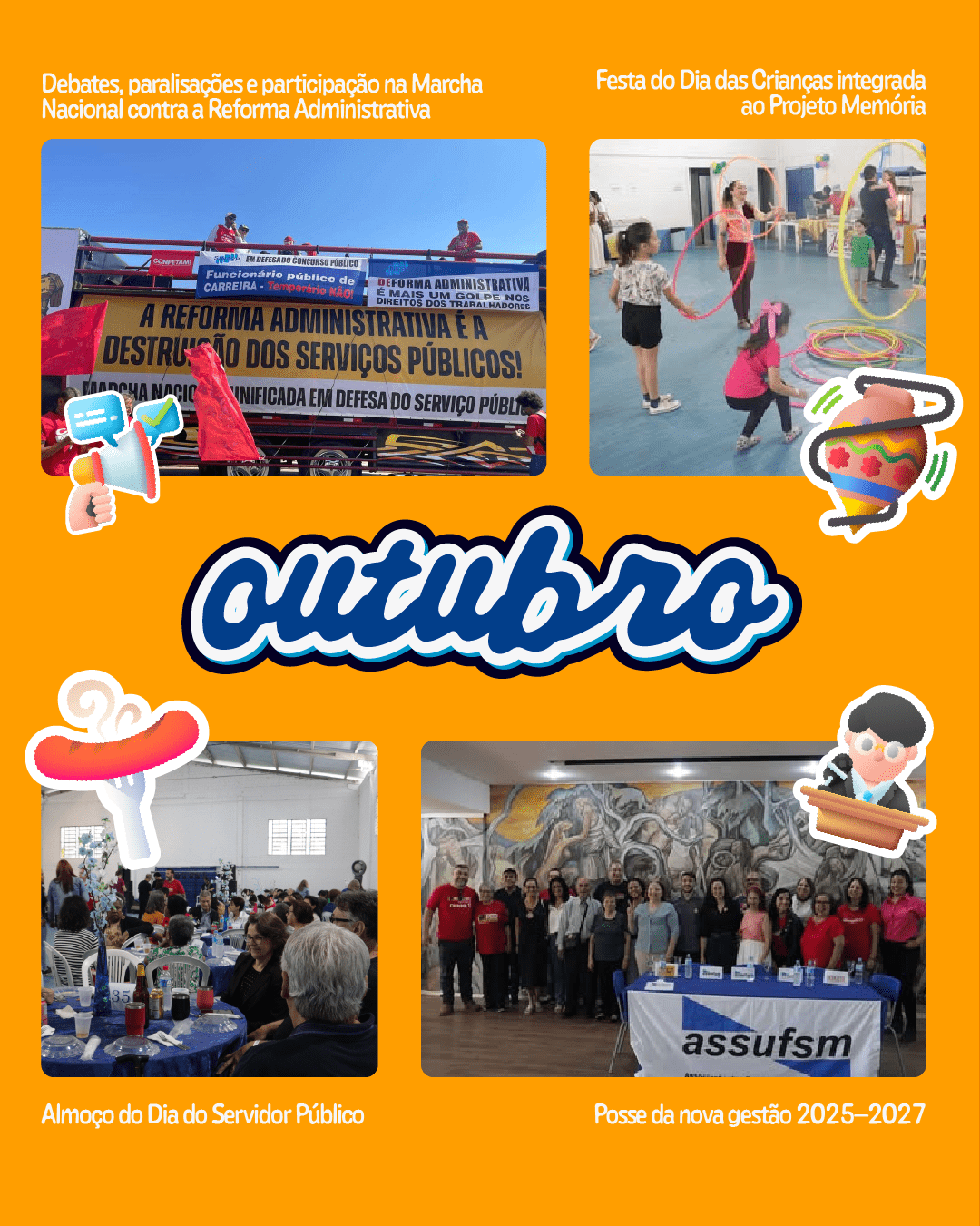 Outubro marcou um novo ciclo político e intensa mobilização em defesa do serviço público. O mês iniciou com a cerimônia de posse da nova gestão da Assufsm (2025–2027), realizada no Salão Imembuí, reunindo representantes de entidades sindicais, da UFSM, do movimento estudantil, assessorias jurídica e contábil, consolidando a transição democrática e o início de um novo período de organização e lutas.