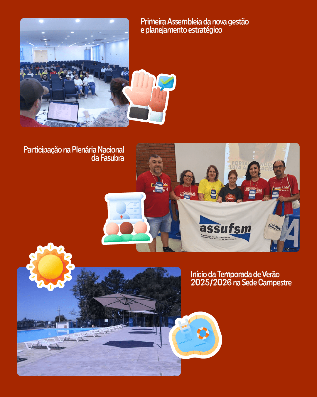 Novembro foi marcado pelo início efetivo da nova gestão (2025–2027), com a realização da primeira Assembleia Geral, que debateu a conjuntura nacional, definiu a delegação da Assufsm para a Plenária da FASUBRA e posicionou a categoria contra a proposta de reajuste do vale-alimentação, por não contemplar aposentados(as). O mês também teve a primeira reunião de planejamento estratégico da gestão, com definição de objetivos e diretrizes para as pastas.