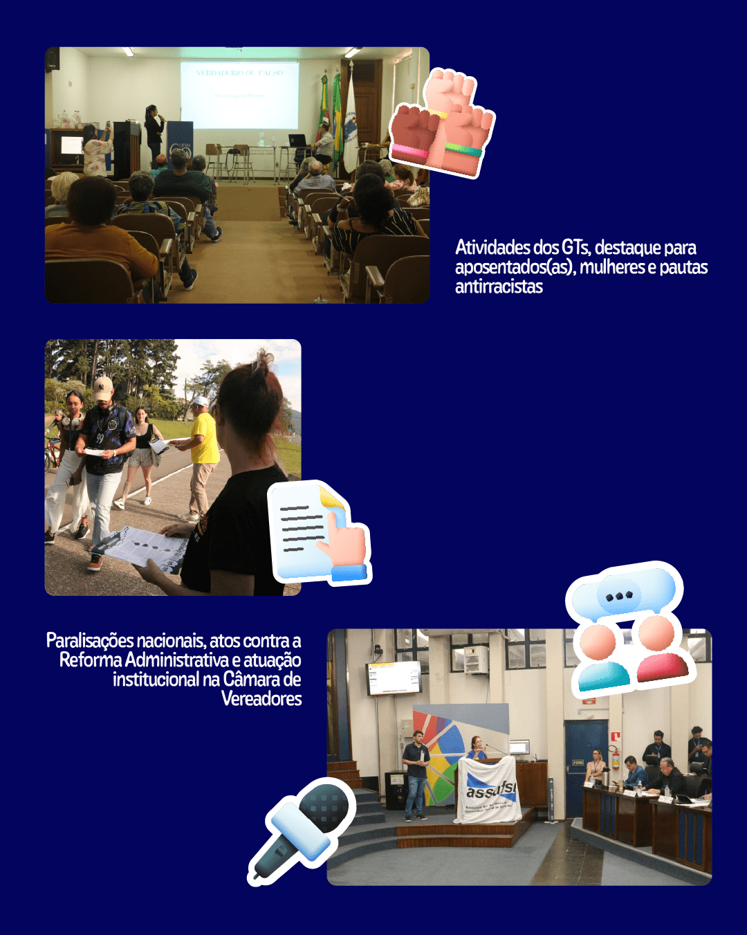 No campo institucional, a entidade participou da Tribuna Livre da Câmara Municipal de Santa Maria, dialogando com vereadores(as) e solicitando apoio político contra a PEC 38, ampliando o debate junto à sociedade e ao poder legislativo local.