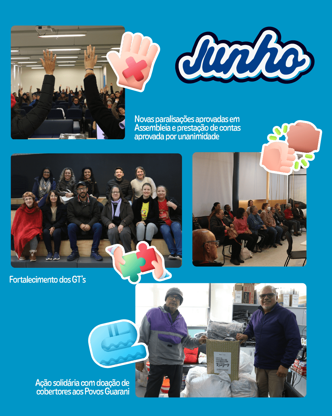 Junho foi marcado por mobilização, organização interna e ações de solidariedade. A Assufsm realizou Assembleia Geral que aprovou novas paralisações nacionais, conforme deliberação da Fasubra, e definiu encaminhamentos para mobilizações em Brasília contra a Reforma Administrativa.