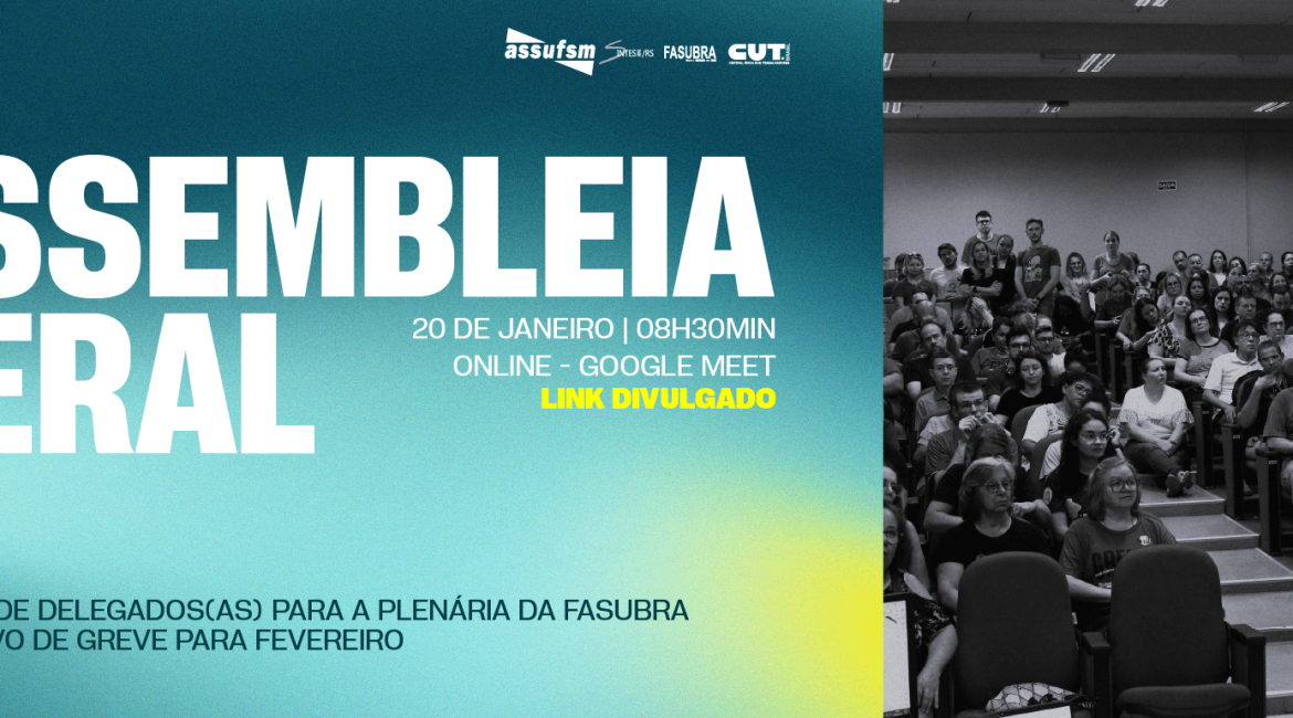 Acesse o link da Assembleia Geral da Assufsm: https://meet.google.com/zbq-cozr-qut e participe dos debates da sua categoria.