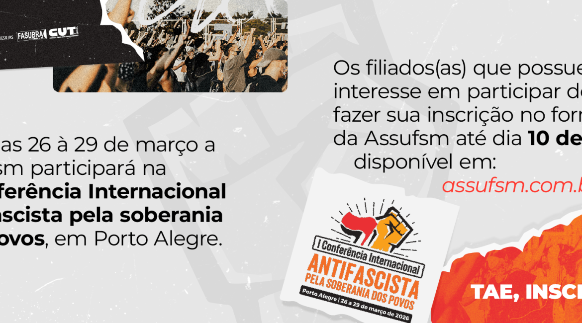 A Assufsm irá participar da I Conferência Internacional Antifascista, na capital gaúcha, de 26 a 29 de março. A Conferência nasce como um ato político urgente de resistência coletiva contra o avanço global da extrema-direita e a escalada autoritária que ameaça os direitos e a democracia.