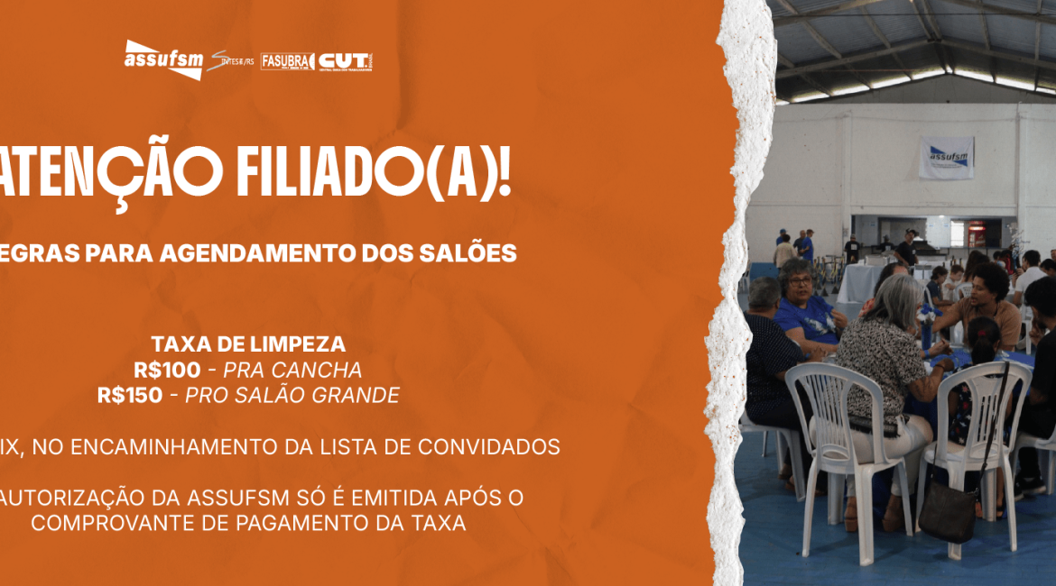 A ASSUFSM comunica aos seus filiados e filiadas que os procedimentos para a reserva dos salões na Sede Campestre passaram por atualizações. O objetivo é garantir a organização, a higiene e o bom uso dos espaços comuns por todos(as)