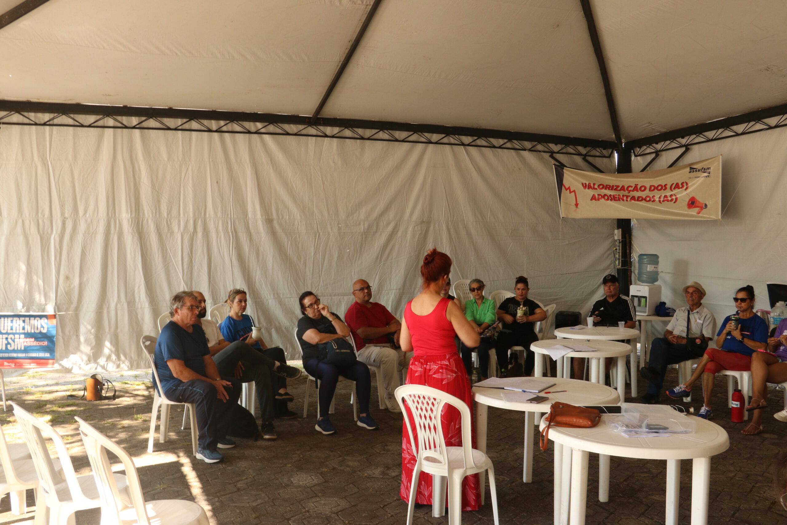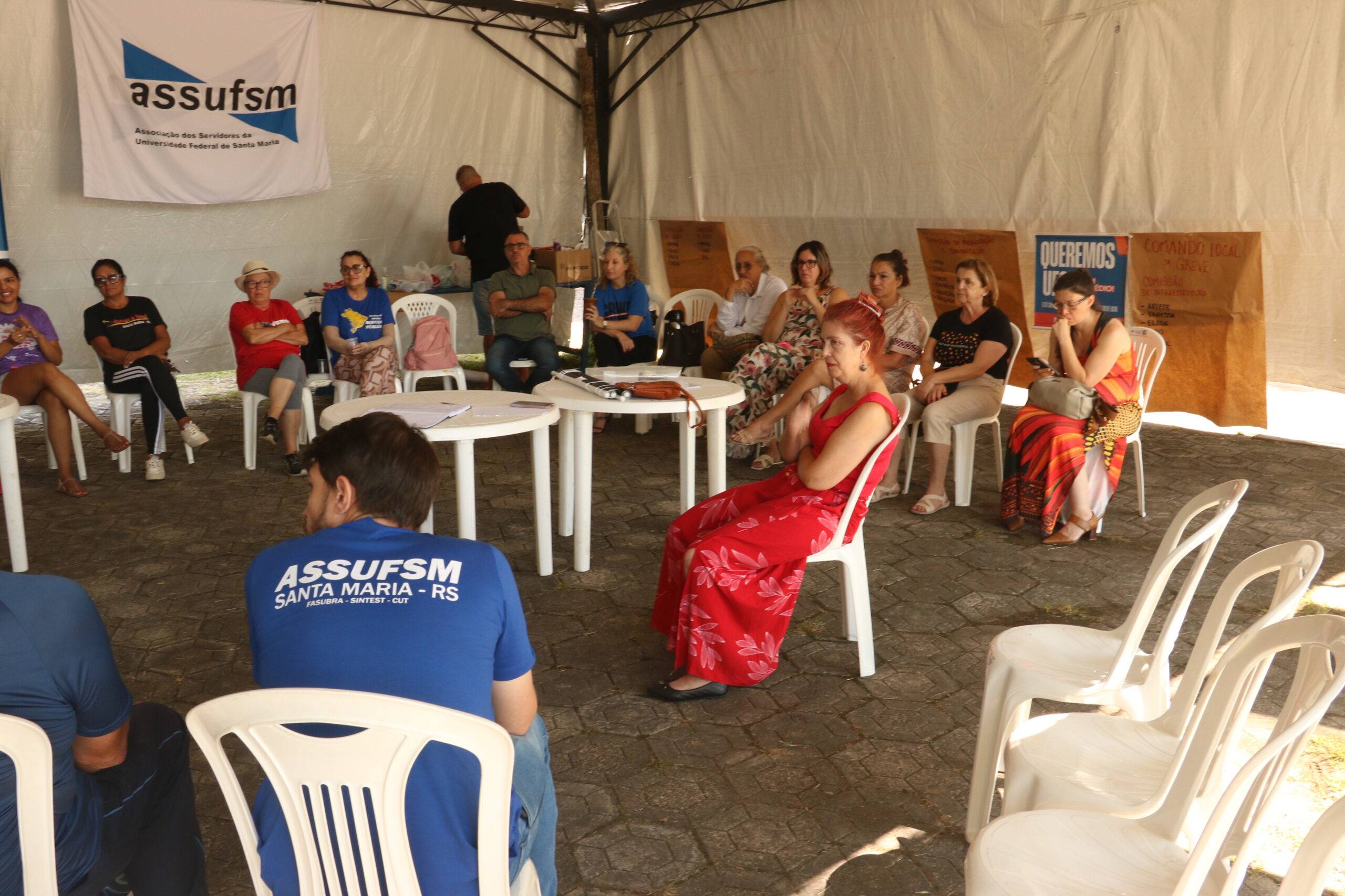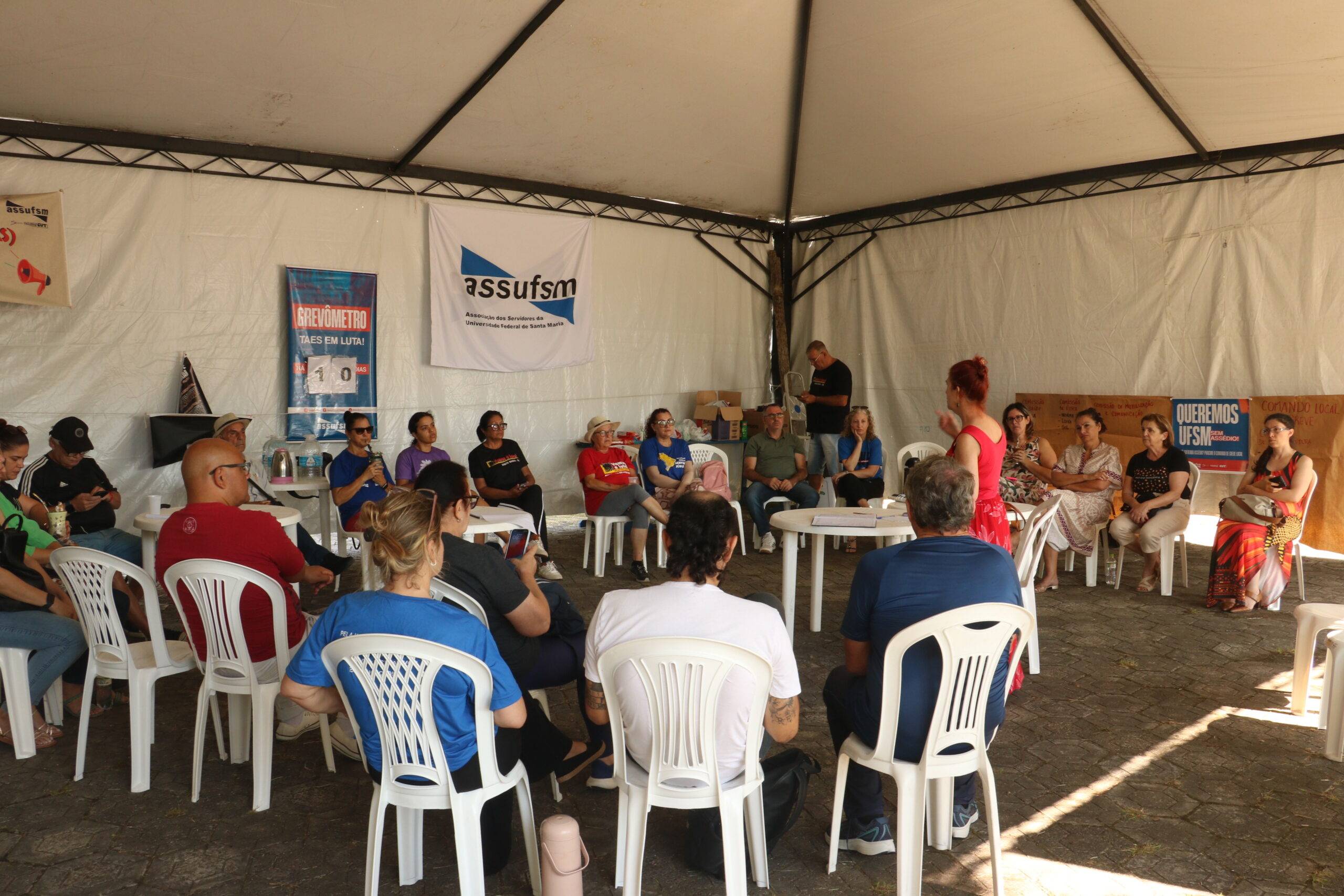 Nesta quinta-feira (05), décimo primeiro dia da greve dos(as) servidores(as) técnico-administrativos(as) em educação da UFSM, foi realizada a tradicional reunião no Lonão da greve, em frente ao INPE, reunindo a categoria para informes e organização das próximas atividades do movimento.