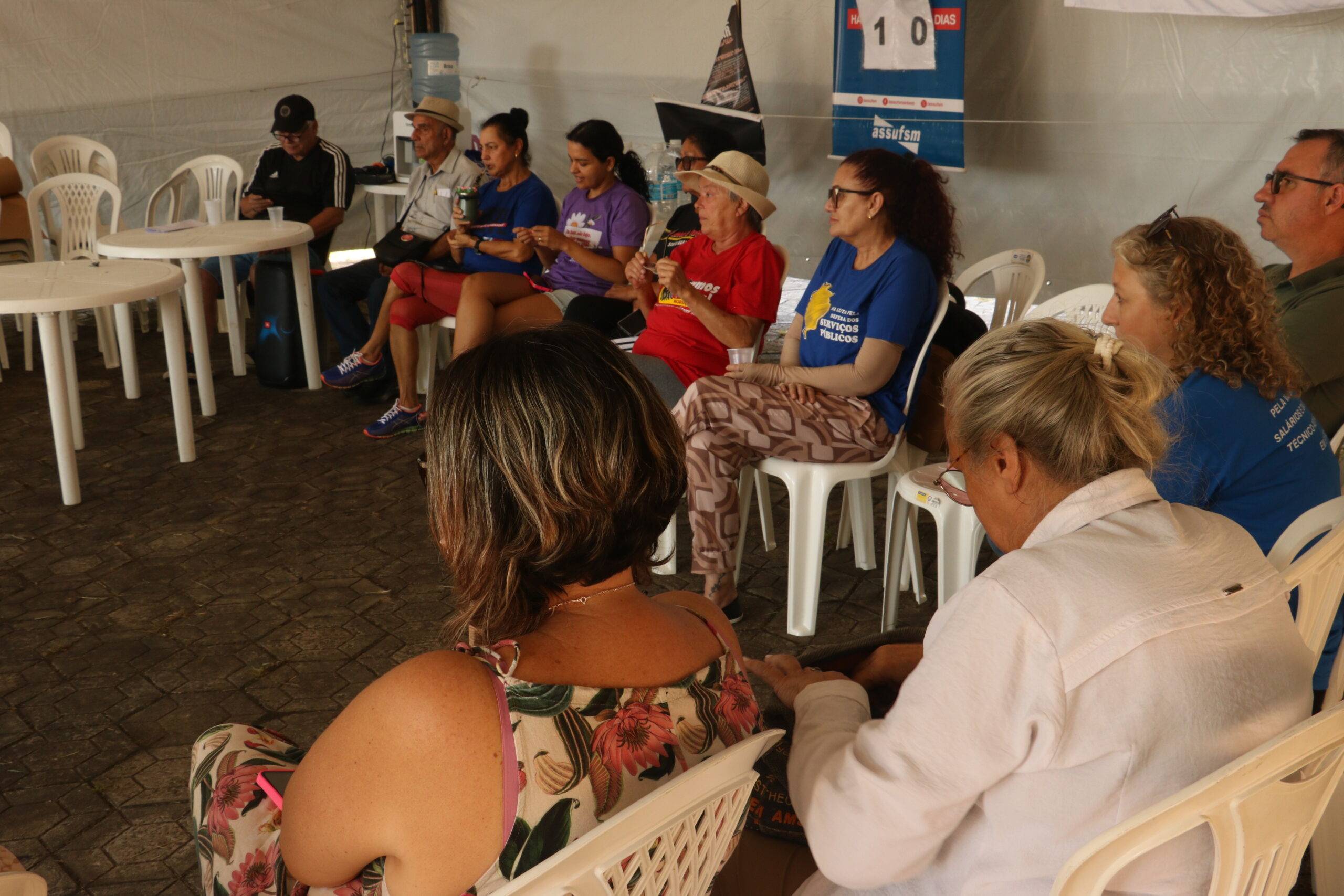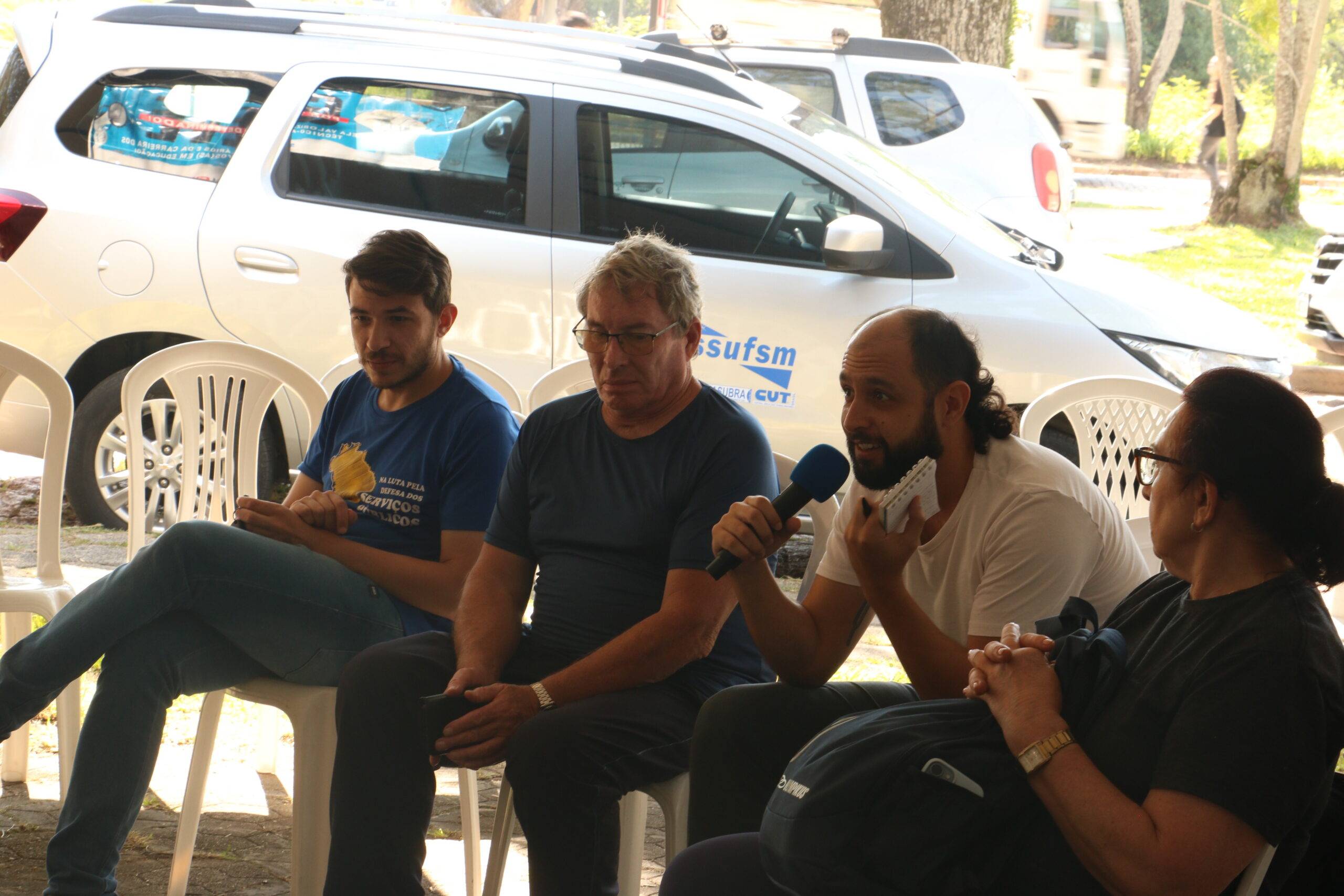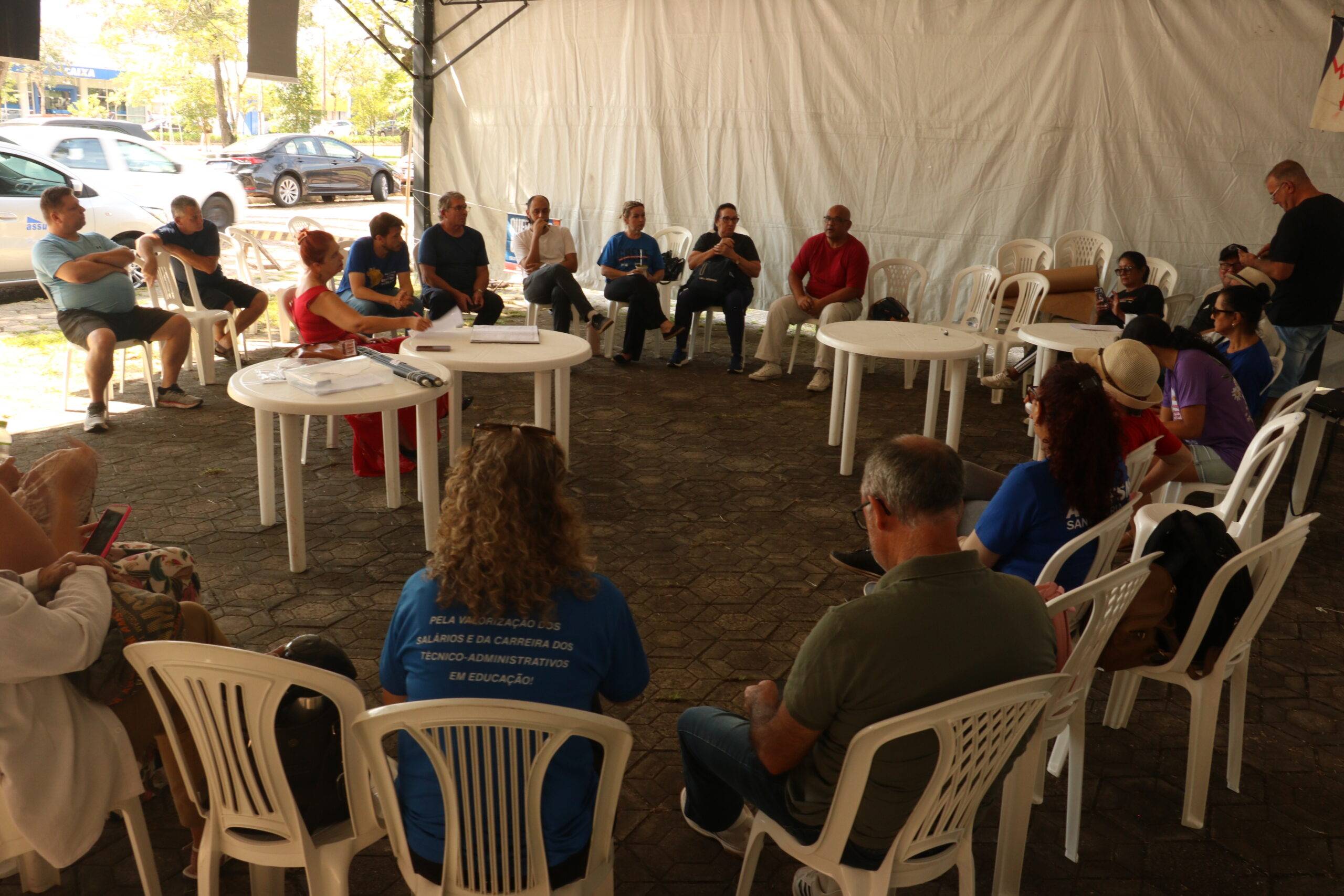 Nesta quinta-feira (05), décimo primeiro dia da greve dos(as) servidores(as) técnico-administrativos(as) em educação da UFSM, foi realizada a tradicional reunião no Lonão da greve, em frente ao INPE, reunindo a categoria para informes e organização das próximas atividades do movimento.