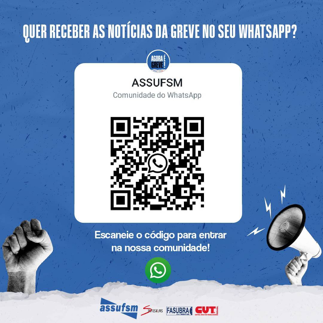 Participe da comunidade da Assufsm no Whatsapp e receba as notícias da greve em primeira mão Em GeralPostou 12/03/2026 Quer receber as notícias da greve no seu Whatsapp? Escaneie o código para entrar na nossa comunidade e receba tudo em primeira mão!