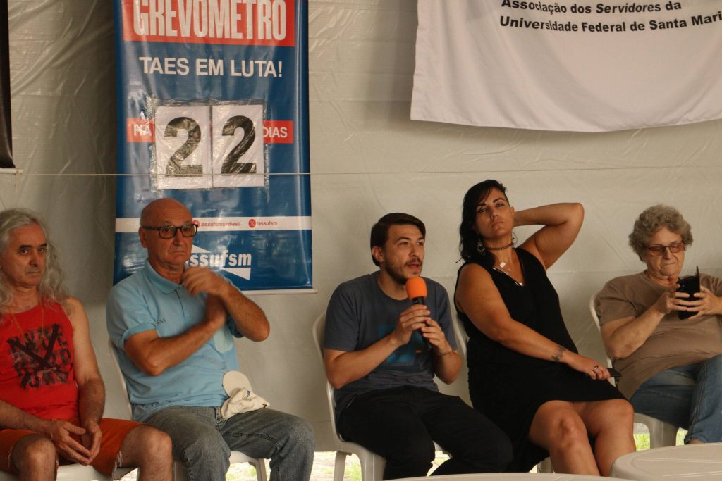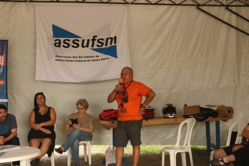 Representando a Sedufsm, o professor aposentado Jadir Lemos destacou o apoio da categoria docente e ressaltou a importância da construção de um ato unificado em defesa do cumprimento do acordo de greve e da universidade pública.