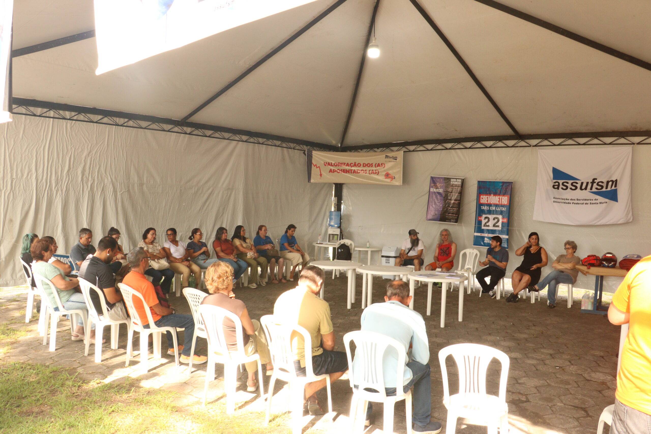 No 22º dia de greve dos(as) Técnico-Administrativos em Educação (TAEs) da UFSM, a reunião do Comando Local de Greve (CLG), realizada na manhã desta segunda-feira, foi marcada por manifestações de apoio, informes da categoria e pela organização das próximas mobilizações do movimento.