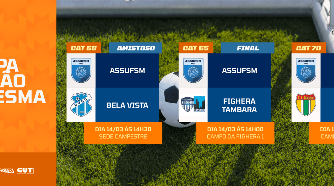 Os times da Assufsm entram em campo no sábado, dia 14 de março, pela Copa Verão da AFUVESMA, com partidas na Sede Campestre. CATEGORIA 60 Anos – AMISTOSO HORA: 14h30min LOCAL: Sede Campestre ASSUFSM X BELA VISTA CATEGORIA 65 Anos – FINAL HORA: 14h LOCAL: Campo da Fighera 1 ASSUFSM X FIGHERA/TAMBARA CATEGORIA 70...