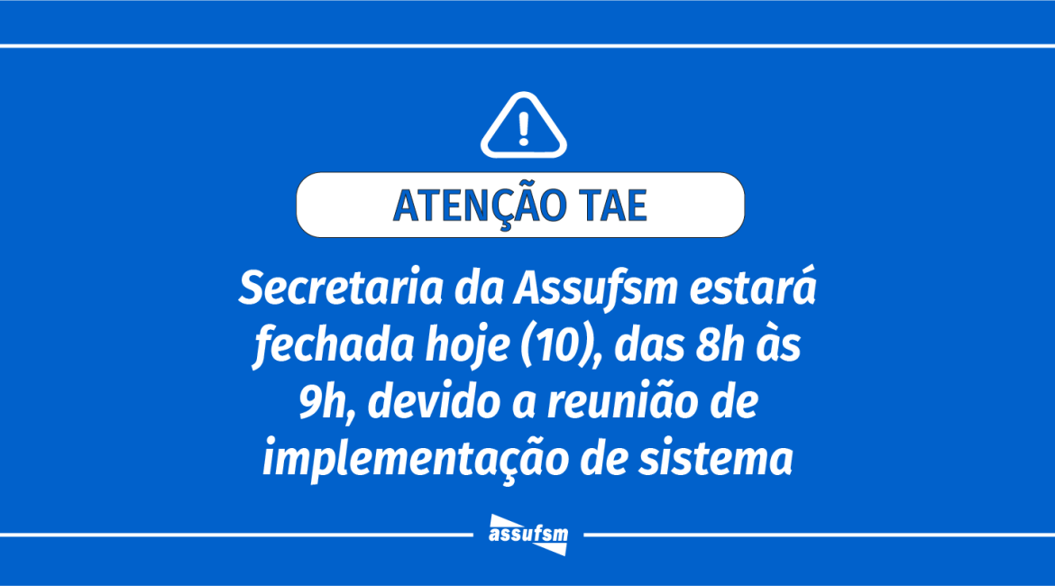 Secretaria da Assufsm informa que hoje, dia 10 de março, estará fechada das 8h às 9h, para a reunião de implementação do novo sistema. Após às 9h, o atendimento segue normalmente, até às 11h30min e, após, das 12h30min às 16h. Agradecemos sua compreensão, TAE!