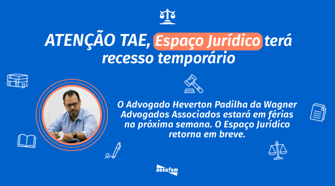 A Assufsm informa que o Espaço Jurídico, na Rádio 800AM, que acontece todas às sextas-feiras, às 12h30min, terá recesso temporário. O motivo é em razão das férias do Advogado Heverton Padilha, da Wagner Advogados Associados, que retorna no início de agosto, palestrando para o GT Assuntos de Aposentadoria e Pensão...