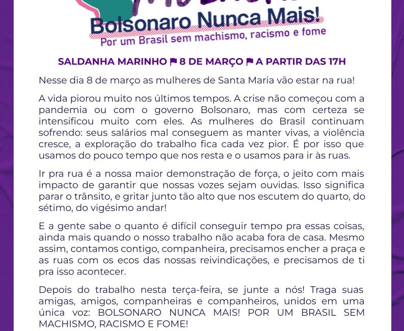 No Dia Internacional da Mulher, terça-feira (8), mulheres de todo o Brasil voltam a protagonizar manifestações nacionais contra o governo Bolsonaro. Entidades e coletivos feministas pretendem ocupar as ruas e as redes para bradar “Pela vida das Mulheres” e “Bolsonaro nunca mais!”. As manifestações estão confirmadas em 30 cidades, em...