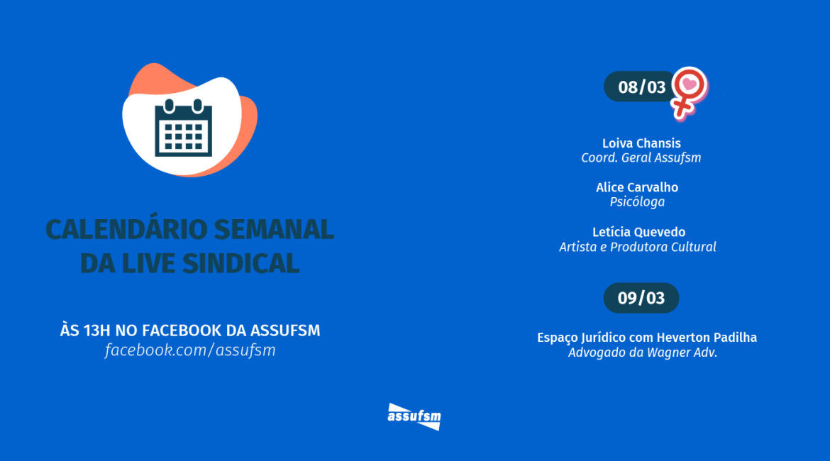 A Assufsm segue debatendo pautas de interesse da categoria na Live Sindical. Excepcionalmente nos meses de janeiro e fevereiro, as Lives Sindicais serão reduzidas para às quartas-feiras, às 13h, pelo facebook do sindicato. Na terça-feira, teremos live sindical extraordinária para debater a Vida das Mulheres. Confira a pauta e convidadas dessa semana. Veja: Terça-feira (08/03) – “Pela vida...